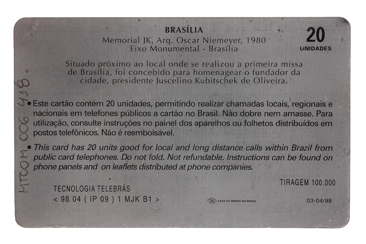 Os primeiros cartões telefônicos no país foram emitidos em 1992, por ocasião da Eco-92, substituindo as fichas telefônicas. O cartão telefônico brasileiro é do tipo indutivo. A tecnologia foi desenvolvida no Brasil, com os primeiros testes sendo realizados pelo Centro de Pesquisa e Desenvolvimento da Telebrás – CPqD. Os cartões telefônicos tinham como função realizar o pagamento de uma ligação em telefone público, também chamado de orelhão. No final da década de 1990, já existiam mais de 350 mil telefones públicos à cartão no Brasil, com uma distribuição mensal de aproximadamente 40 milhões de unidades. A grande variedade de estampas que traziam informações, cultura e arte, além do baixo custo e facilidade de obtenção, estimularam o colecionismo dos cartões telefônicos, que ficou conhecido como Telecartofilia. / Informações sobre os cartões telefônicos retiradas de https://pt.wikipedia.org/wiki/Cart%C3%A3o_telef%C3%B4nico, acessado em outubro de 2019, e da publicação da Telebrás “Cartões Telefônicos, cinco anos contando a nova história do Brasil