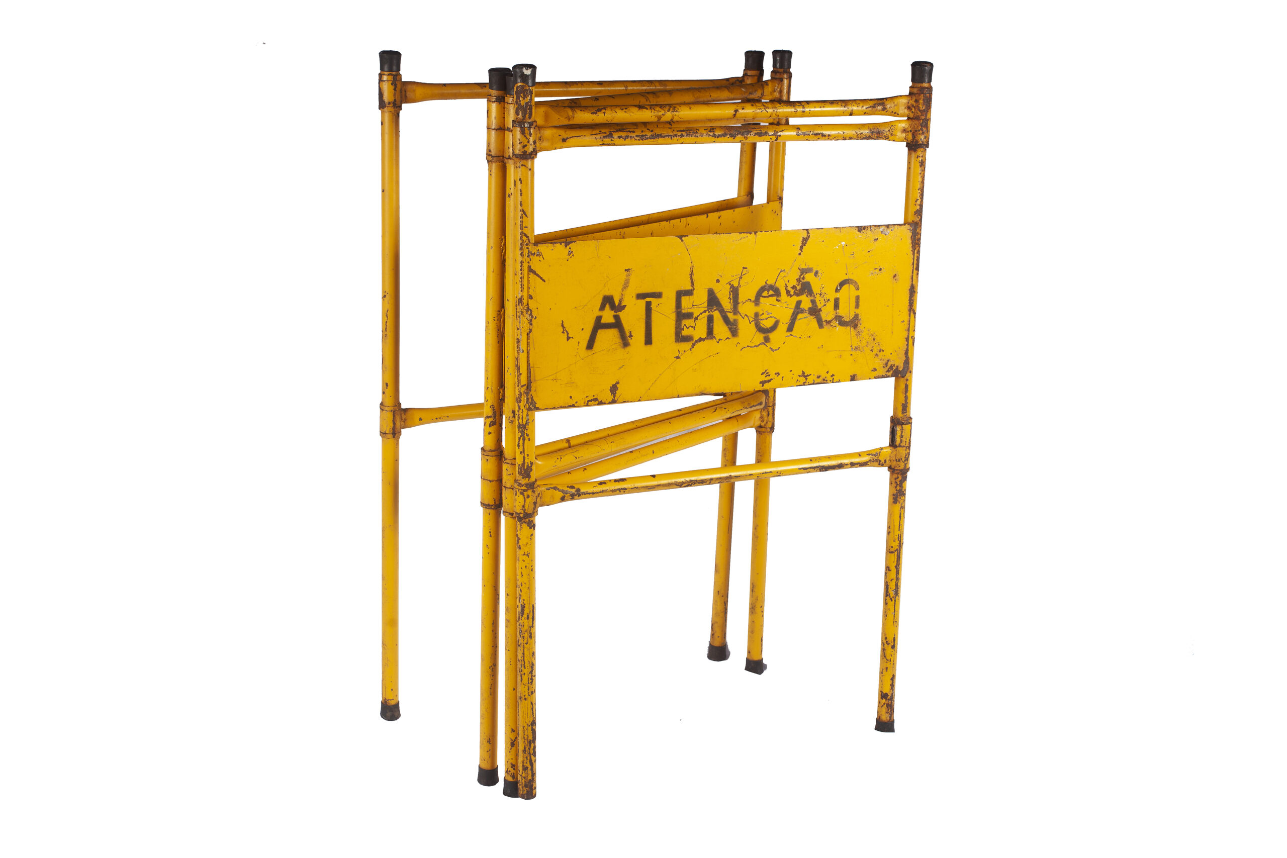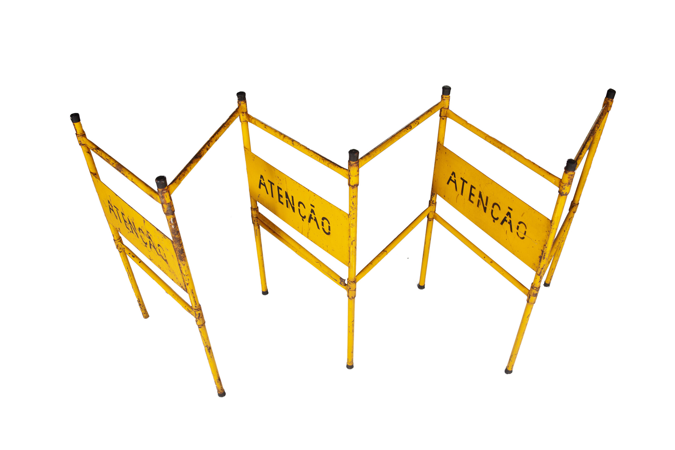 Barreira modular articulável para isolamento e contenção na cor amarela. Objeto composto por hastes interligadas em movimento de zigue-zague, contendo entre elas, ao centro, três placas retangulares com inscrição "ATENÇÃO'.