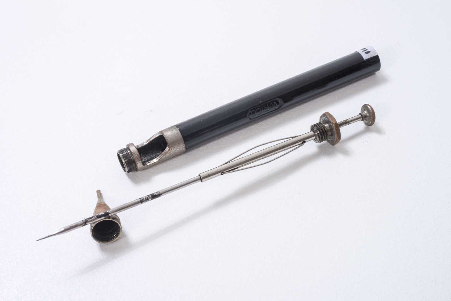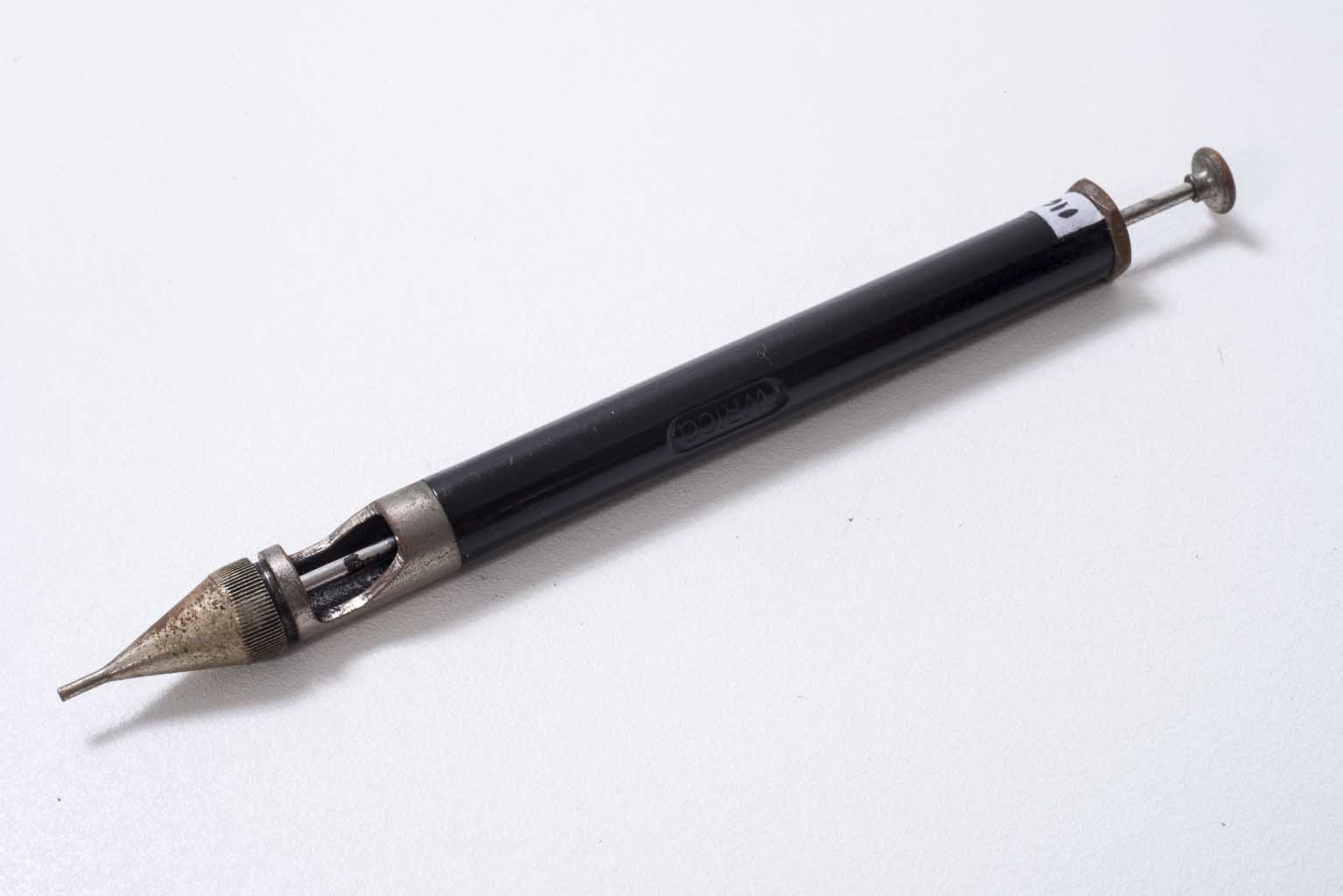 Objeto de corpo cilíndrico em metal esmaltado na cor preta e as extremidades em metal prateado. Em uma das extremidades está a ponta do tinteiro e na outra haste de regulagem. No tubo, ao centro, a inscrição encava WRICO, dentro de elipse. A ponta tinteiro apresenta inscrição encava 3.