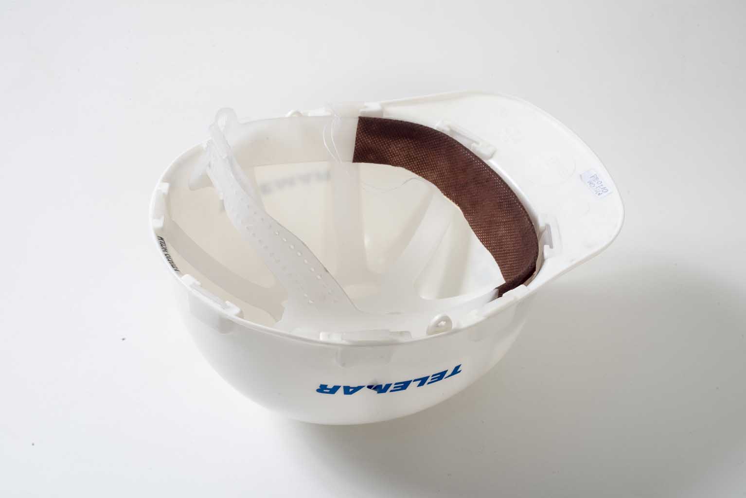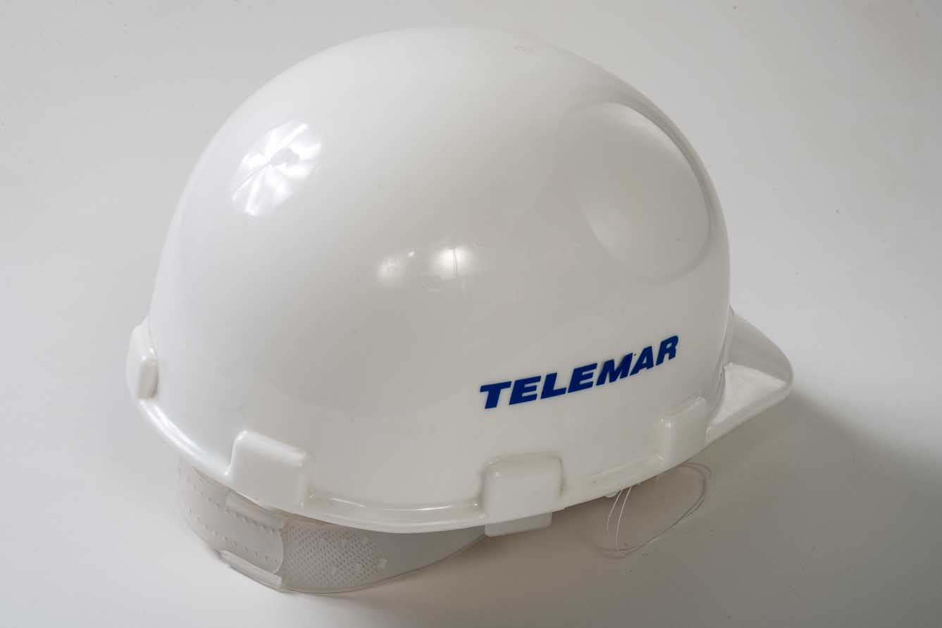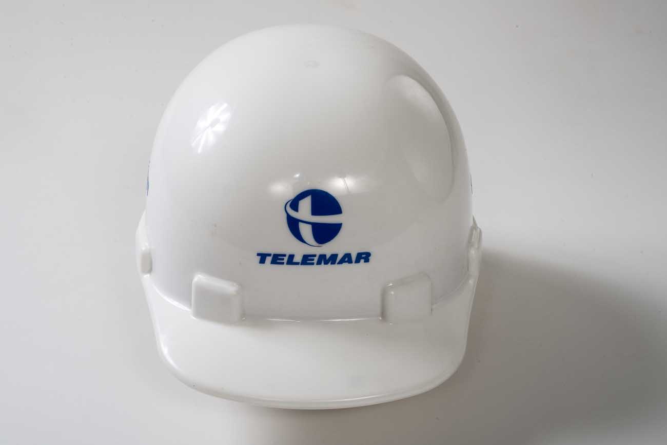 Capacete na cor branca em formato de concha e com aba na parte frontal. Também na parte frontal logotipo da TELEMAR na cor azul. Nas laterais TELEMAR em azul. Possui próximo as bordas inferiores abas em relevo para fixação internas de carneiras. Na parte interna carneira de plástico transparente com alça ajustável para fixação na parte traseira na cabeça e retentor de suor em tecido na cor marrom na parte frontal.