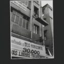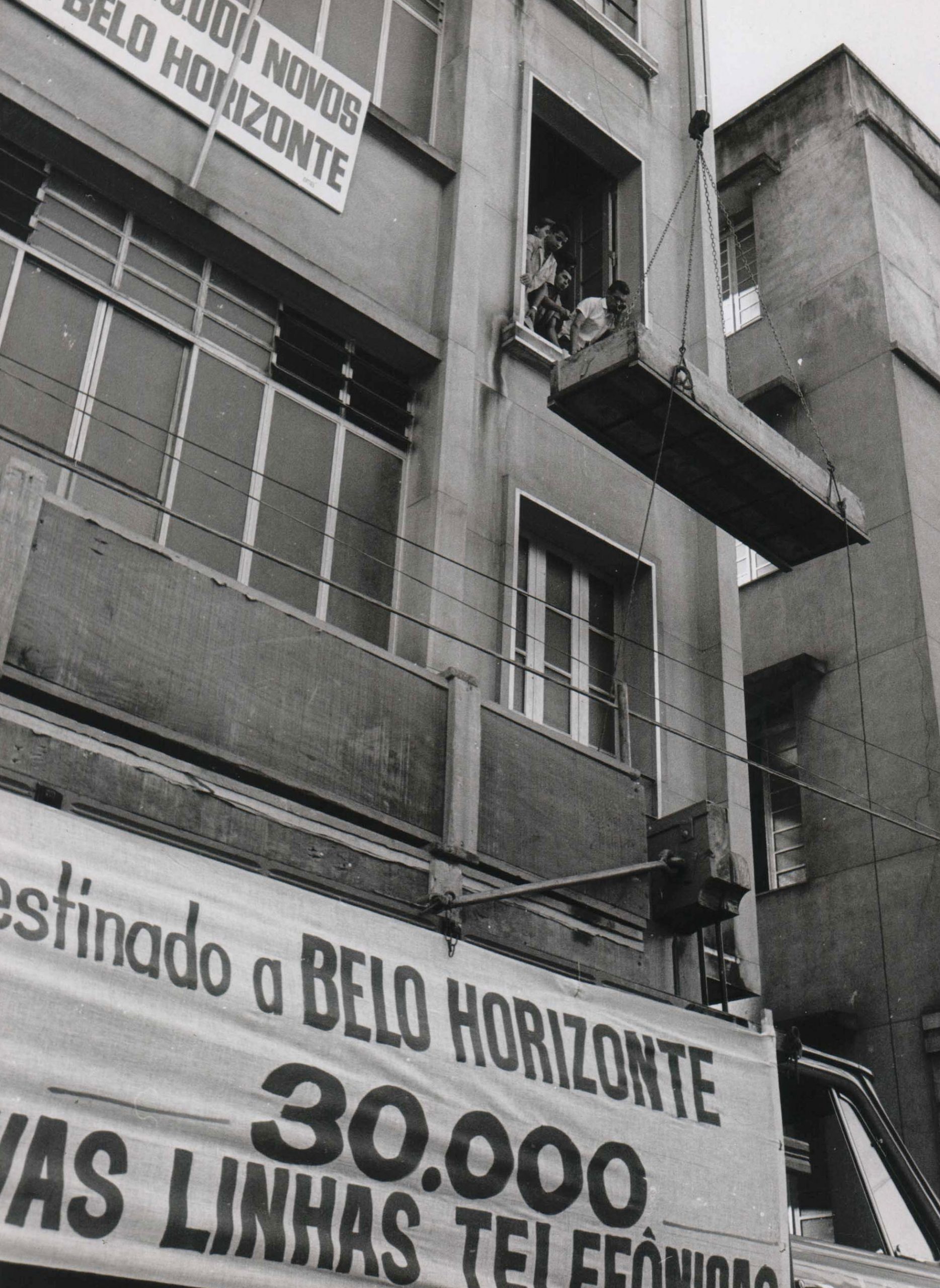 Fotografia em preto e branco em Belo Horizonte, em Minas Gerais. Em primeiro plano, fachada de prédio contendo duas faixas fixadas, uma no térreo e outra no terceiro andar, com as inscrição: "(...)0.000 NOVOS / (...) BELO HORIZONTE" e "(...)estinado a BELO HORIZONTE / 30.000 / (...)VAS LINHAS TELEFÔNICAS". Em uma das janelas do terceiro andar, pessoas na janela observando caixa de madeira sendo içada por polias/roldanas de elevação.
