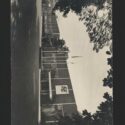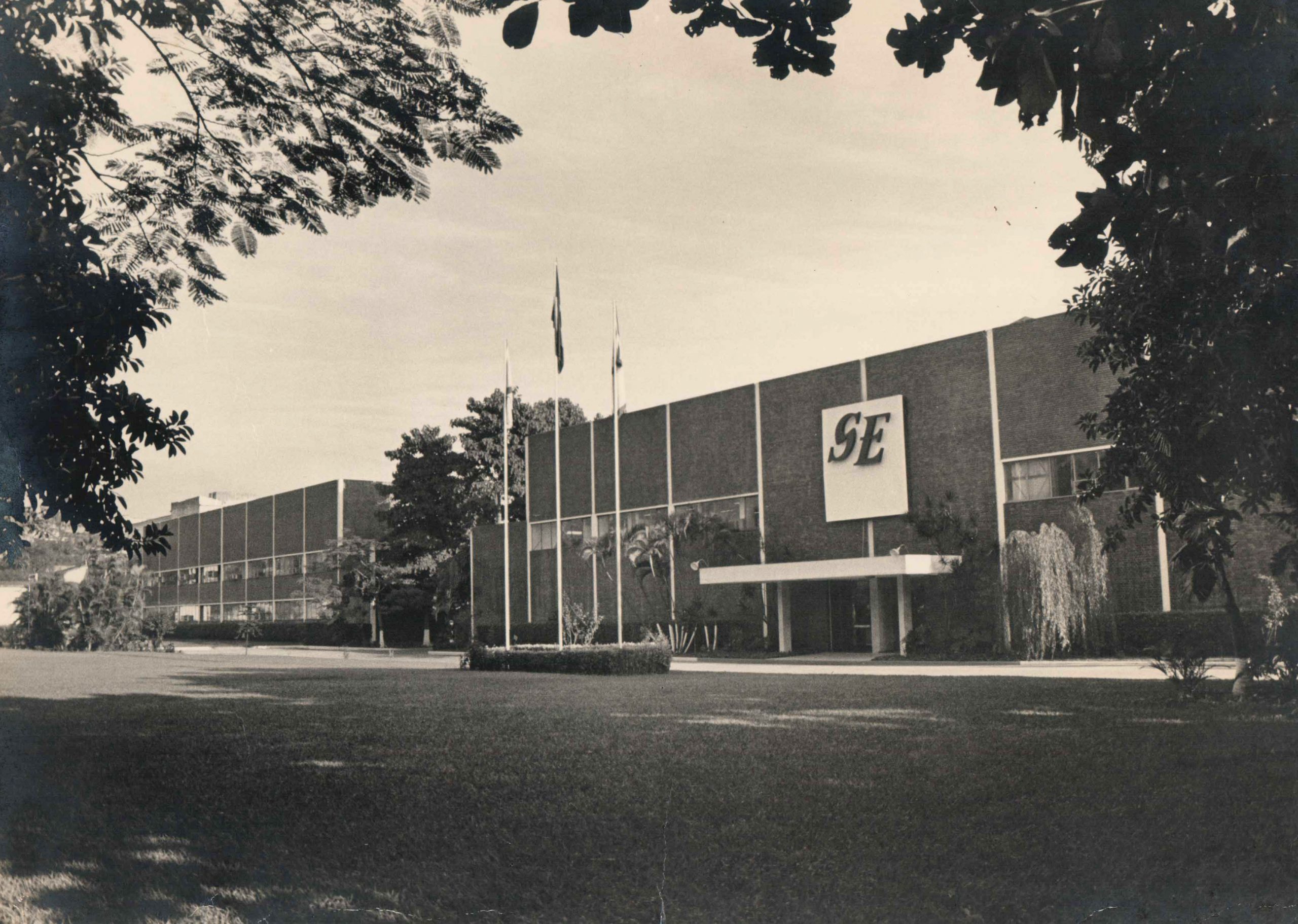 Fotografia em preto e branco em Vicente de Carvalho, no Rio de Janeiro. Em primeiro plano, acima, folhas de árvores à esquerda e à direita. Em segundo plano, arbustos e três bandeiras hasteadas. Ao fundo, fachada da fábrica da Standart Electrica contendo logomarca "SE".