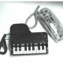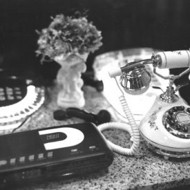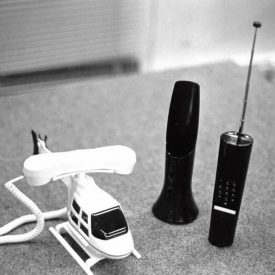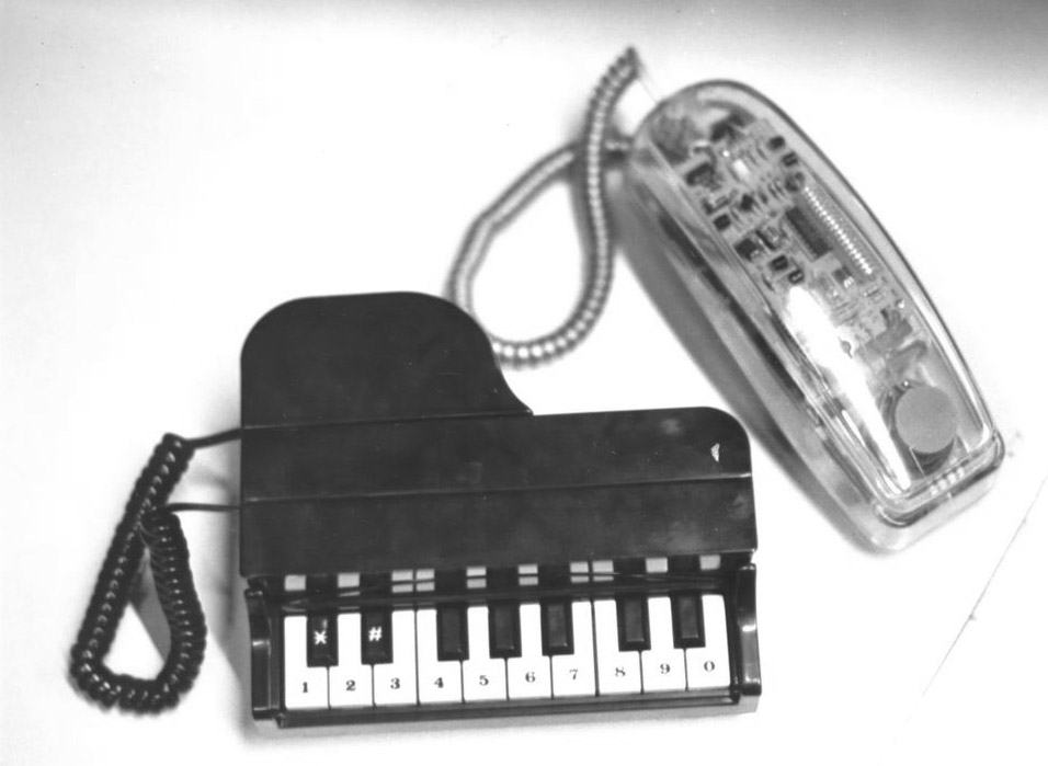 Fotografia em preto e branco. No primeiro plano, dois telefones, o do centro em formato de piano e o do lado direito transparente.