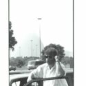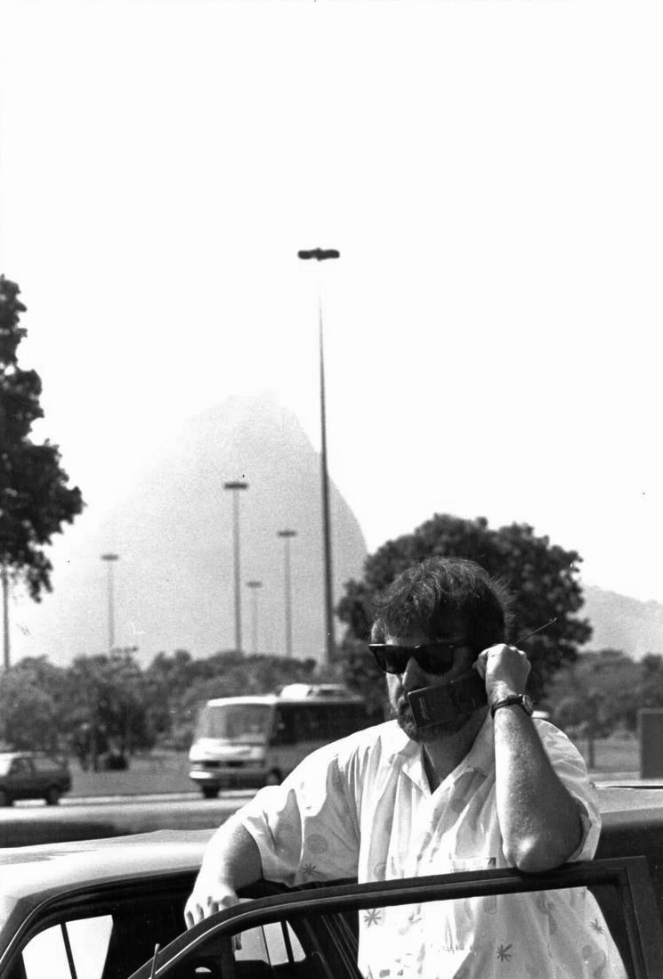 Fotografia em preto e branco. No primeiro plano, usuário de pé apoiada em porta de carro aberta, com celular em uma das mãos em direção ao rosto. No segundo plano, pista arborizada do Aterro do Flamengo com carros e postes. Ao fundo, pão de açúcar.