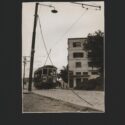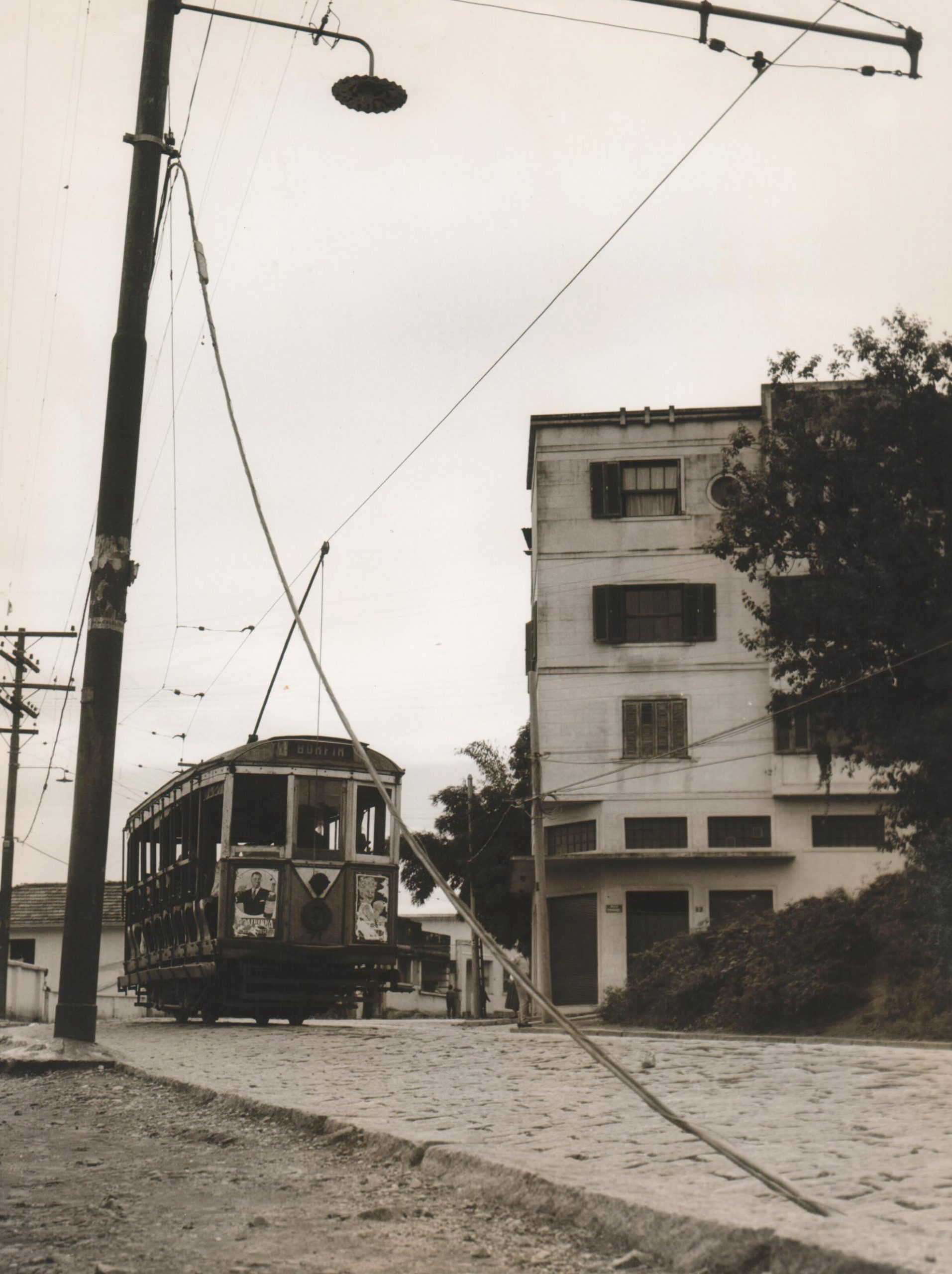 Fotografia em preto e branco. Em primeiro plano, à esquerda, poste de luz. Ao lado, parte de rua de paralelepípedos. Em segundo plano, bonde "BOMFIM" na rua. À direita, prédio e árvores. Ao fundo, casas.
