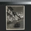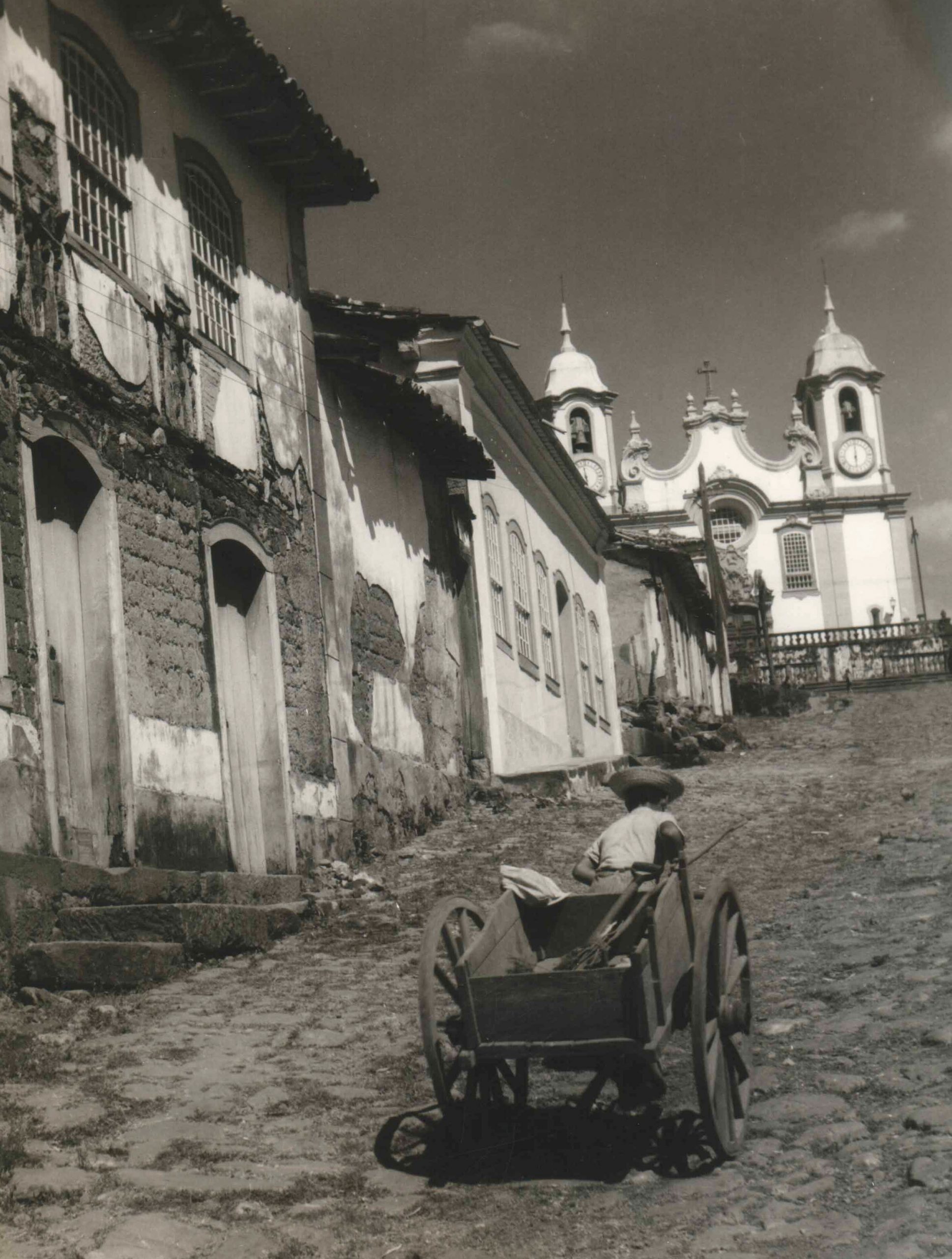 Fotografia em preto e branco em Tiradentes, em Minas Gerais. Em primeiro plano, à direita, homem puxando carroça em ladeira. Em segundo plano, à esquerda, casas no estilo colonial. Ao fundo, igreja em parte elevada.