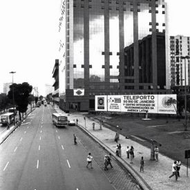 Fotografia em preto e branco. No primeiro plano, prédio do Teleporto, no Centro do Rio de Janeiro, com destaque para a placa no canto inferior direito.