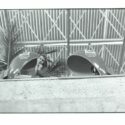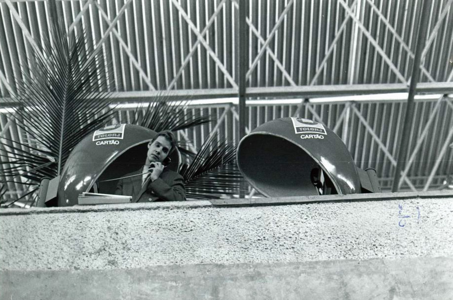 Fotografia em preto e branco. No primeiro plano, no centro, dois telefones públicos/ orelhões, com cúpulas em fibra de vidro com as inscrições "Cartão" e a a logomarca da Telerj. Os dois telefones estão presos, cada um em uma haste de metal. O telefone do lado direito está sendo utilizado por um homem.