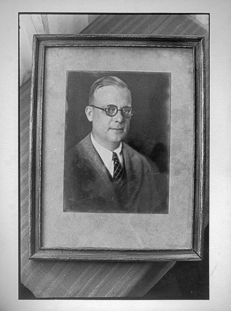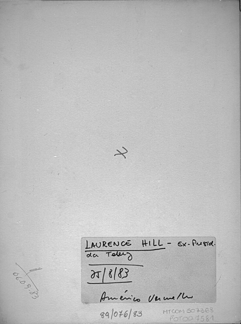 Fotografia em preto e branco. No primeiro plano, quadro com imagem do ex-presidente da Telerj Laurence Hill. No segundo plano, mesa.