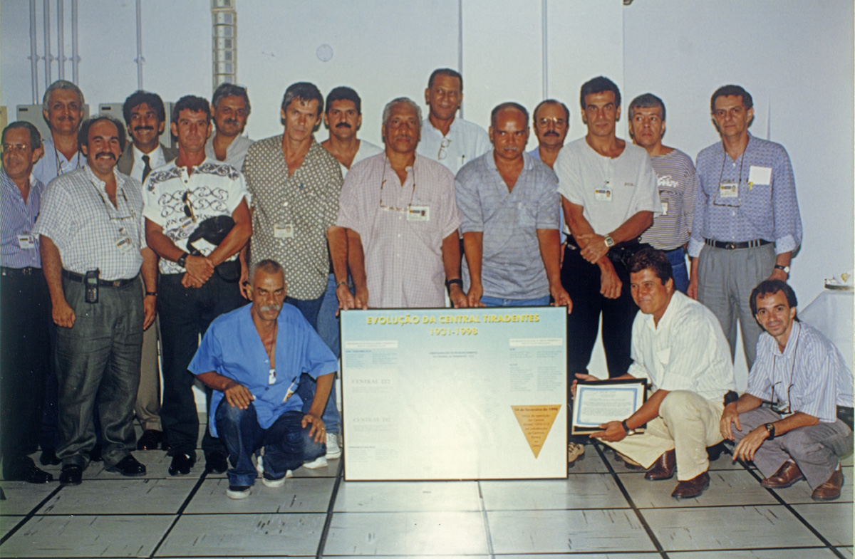 Fotografia colorida. Em destaque, dezoito funcionários da Estação Tiradentes, estando três agachados junto a uma placa na cor azul e quinze em pé, por ocasião do coquetel em comemoração a digitalização da Estação.