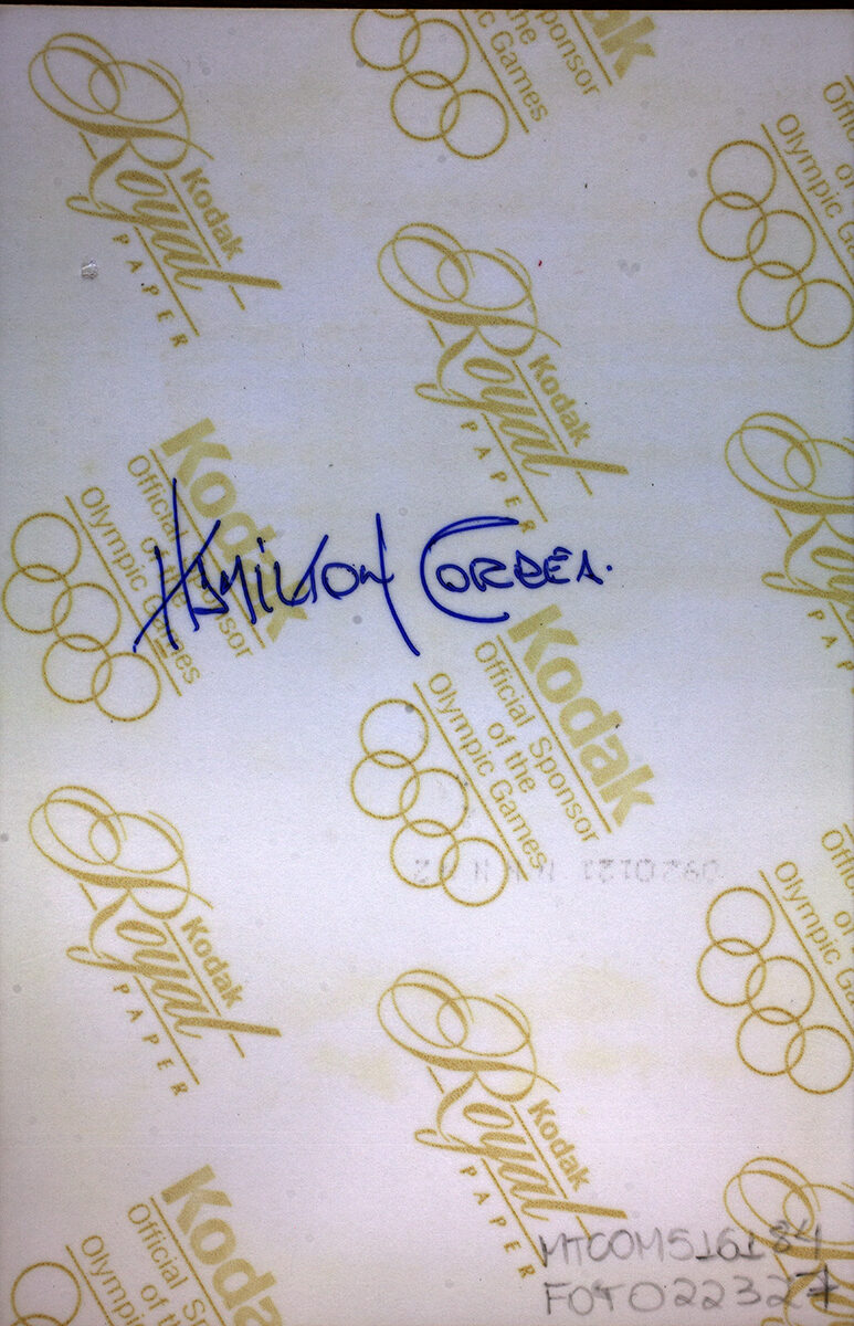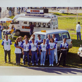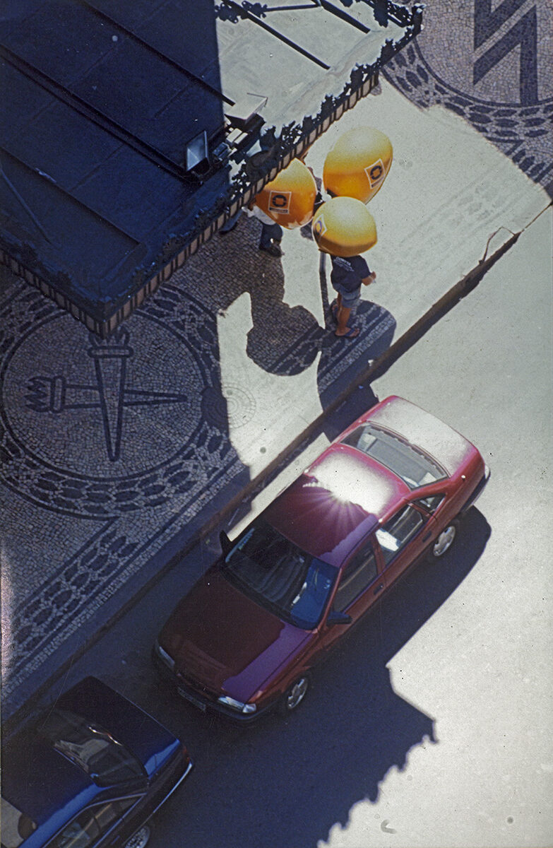 Fotografia colorida na Praia de Ipanema no Rio de Janeiro. Vista tomada de cima. Parte de telhado de metal sobre calçada de pedra portuguesa nas cores preto e branco, pessoas em pé, três cúpulas de orelhões na cor laranja com logo e inscrição "TELERJ", duas pessoas usando os telefones, parte da rua e carro vermelho.