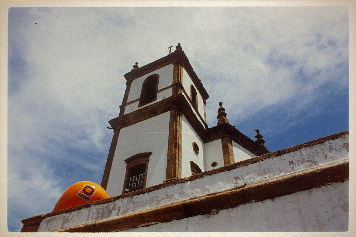 Fotografia colorida. Dentro de borda na cor branca, em primeiro plano, muro tendo acima, à esquerda, parte de cúpula de orelhão de cor amarela, voltado para direita, com logomarca da Telerj , parte visível. Ao fundo, ao centro, parte superior de igreja (Outeiro da Gloria) voltada levemente para esquerda. Céu azul com nuvens.