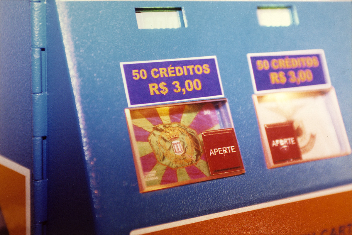 Fotografia colorida no Sambódromo da Marquês de Sapucaí, no Centro do Rio de Janeiro. Parte de máquina de venda de cartões telefônicos na cor azul contendo dois visores eletrônicos, seguidos de duas etiquetas com as inscrições 50 CRÉDITOS / R$ 3,00 e, abaixo de cada uma, um visor retangular transparente com botão com a inscrição APERTE. Dentro dos visores encontram-se cartões telefônicos estilizados com bandeiras de escolas de samba, sendo o da esquerda da Estação Primeira de Mangueira e o da direita da União da Ilha do Governador. Abaixo dos visores, parte de etiqueta na cor amarela. Na lateral da máquina, parte de etiqueta com logomarca da Telerj.