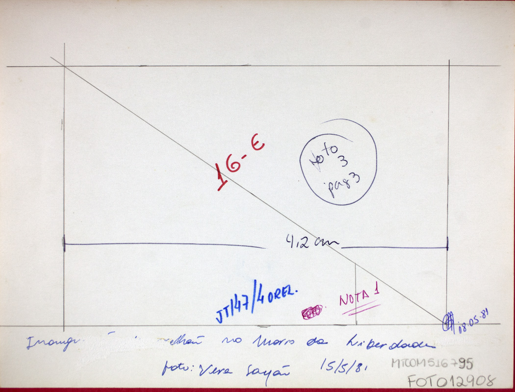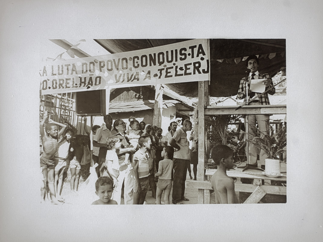 Fotografia em preto e branco no Morro da Liberdade, na Tijuca, no Rio de Janeiro. Em primeiro plano, à esquerda menino de frente e à direita menino de costas. Em segundo plano, à esquerda três meninos apoiados em grade de janela, pedestal e caixa de som, ao centro grupo de pessoas em pé, à direita palco de madeira, vasos de planta, pedestal e microfone, homem de terno segurando papel. Acima faixa com a inscrição "A LUTA DO POVO CONQUISTA/ O ORELHÃO VIVA A TELERJ". Ao fundo construções de madeira.