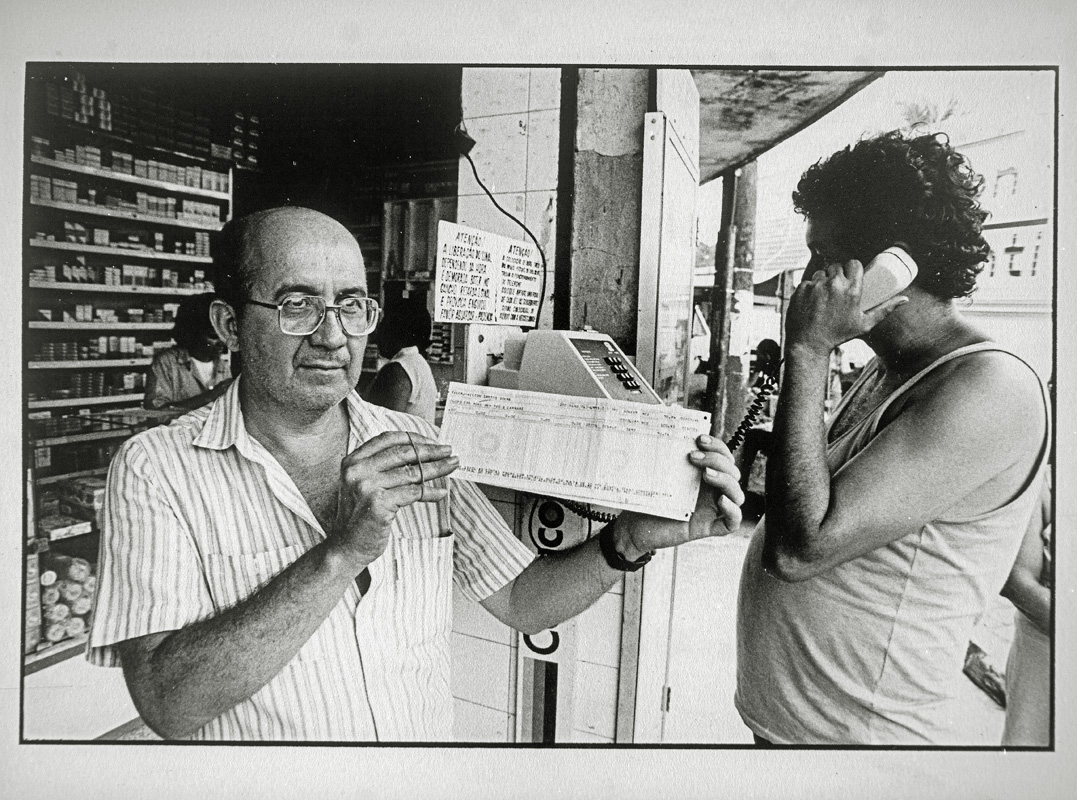 Fotografia em preto e branco em Nova Iguaçu, no Rio de Janeiro. No primeiro plano, homem em pé segurando conta telefônica da Telerj endereçada a Wilton Santos Silva. No segundo plano, telefone semi público contendo logomarca do Sistema Telebrás, sobre suporte preso à coluna de azulejos, e homem em pé à frente dele, segurando monofone do mesmo em direção ao ouvido. Atrás do telefone, placa com as inscrições ATENÇÃO! / A LIBERAÇÃO DO SINAL / DEPEDENDO DA HORA / É DEMORADA. BATER NO / GANCHO RETARDA O SINAL / E PROVOCA ENGUIÇO. / FAVOR AGUARDAR C/ PACIÊNCIA. e ATENÇÃO! / A COLOCAÇÃO DE DUAS, TRÊS / OU MAIS FICHAS DE UMA SÓ VEZ / TRAVA O FUNCIONAMENTO / DO TELEFONE. / COLOQUE APENAS UMA FICHA / DE CADA VEZ. AS SUBSEQUENTES / SERÃO COLOCADAS DE / ACORDO COM A NECESSIDADE.. Ao fundo, à esquerda, parte interna de farmácia com pessoas em pé, balcão com objetos e armários com caixas. À direita, parte de rua com poste, pessoas e partes de veículos.