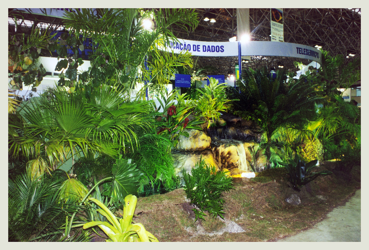 Fotografia colorida. Em primeiro plano, parte externa de estande do Sistema Telebrás com decoração de plantas e pedras. Acima, em segundo plano, as inscrições "[COMUNI]CAÇÃO DE DADOS" e "TELESERVIÇOS". Ao fundo, na parte superior, estrutura metálica cobrindo o teto. Localizado na Exposição Mundial de Ecoturismo World Ecotur 97, no Riocentro.