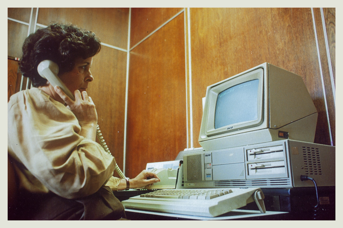Fotografia colorida no Rio de Janeiro. Em primeiro plano, à esquerda mulher sentada de perfil segurando o monofone com a mão direita, à direita parte de mesa com computador ligado, com entrada para dois disquetes, a frente teclado. Ao fundo parede possivelmente de madeira.