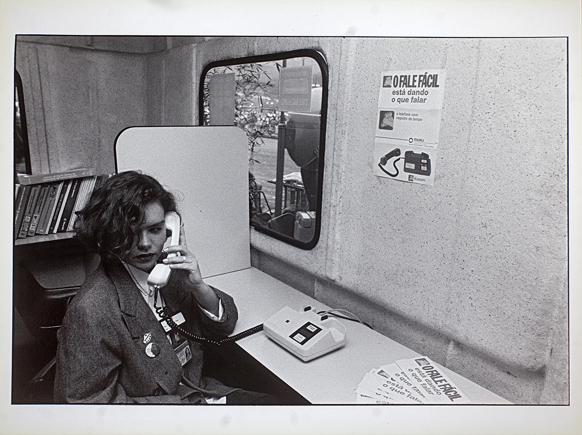 Fotografia em preto e branco. Dentro de cabine, à esquerda, figura humana feminina, sentada, com o cotovelo apoiado em bancada, voltada para direita, utilizando aparelho telefônico modelo KS; na parede, janela e propaganda sobre o serviço telefônico, com logomarca da Telerj e folhetos sobre a bancada, à direita.