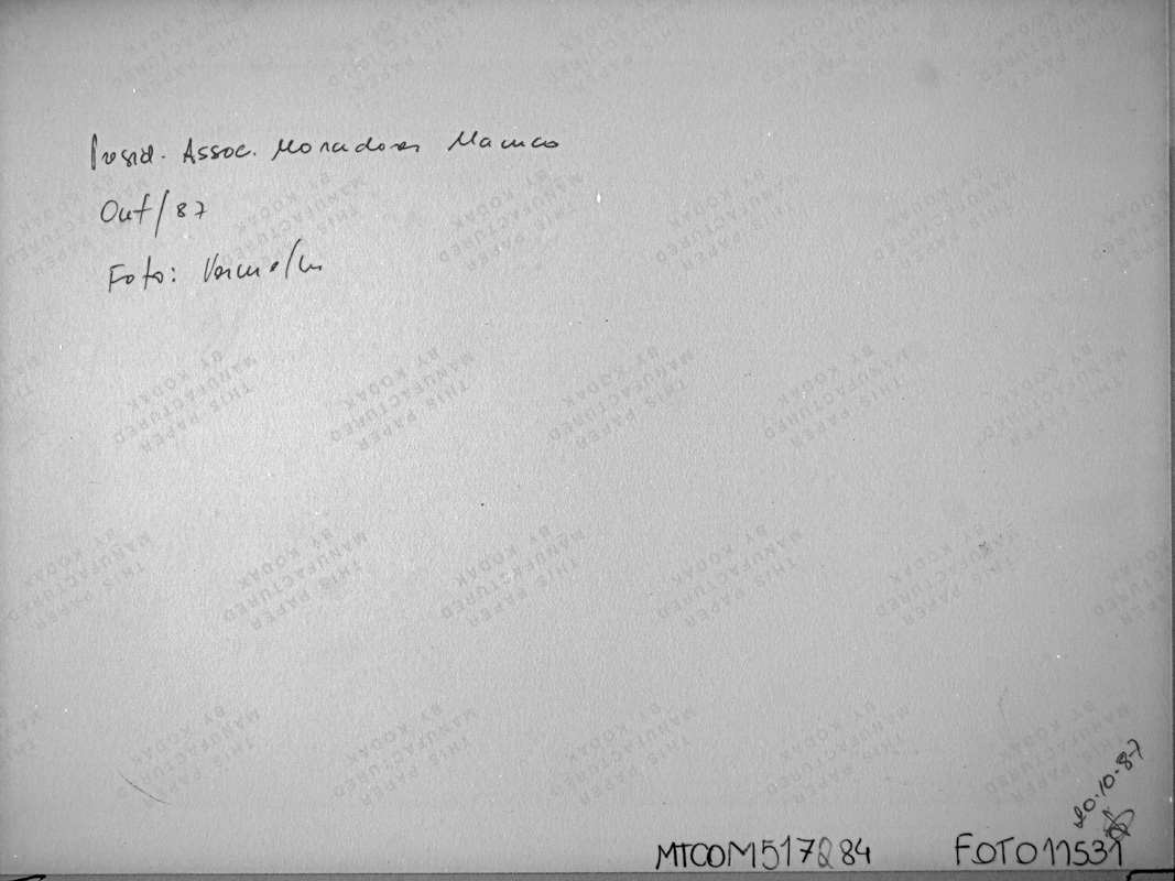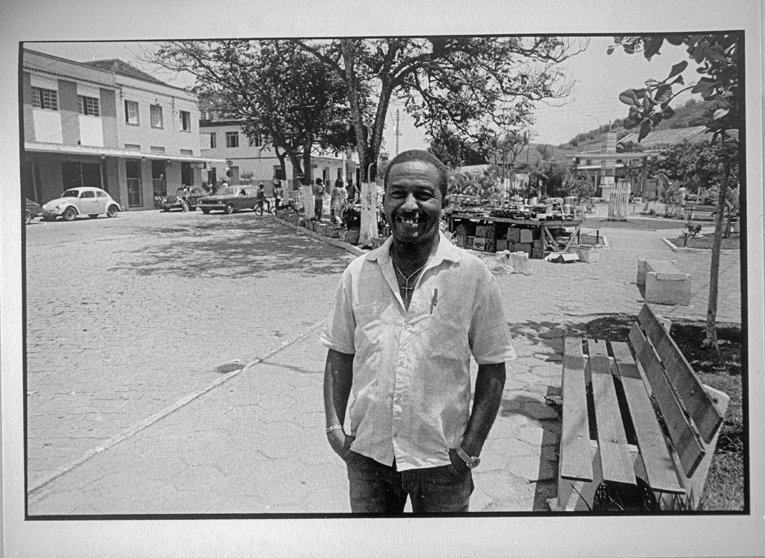 Fotografia preto e branco. Em primeiro plano, ao centro, figura humana masculina, em posição frontal, de pé, em praça pública. Em segundo plano, à direita, banco,: à esquerda, faixa de rolamento, com veículos. Ao fundo: à direita, bancada de feira, e arbustos; à esquerda, construções, árvores e transeuntes.