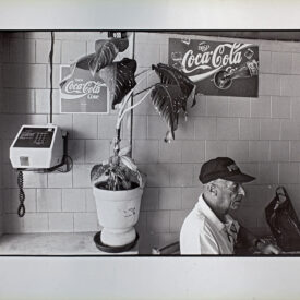 Fotografia em preto e branco. Vista superior de parte da Companhia Siderúrgica Nacional com edifícios, ruas, casa, árvores e estacionamento com automóveis. Ao fundo, faixa horizontal de montanhas.