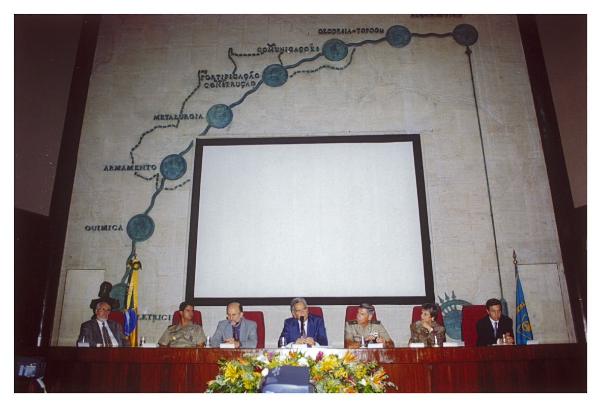 Fotografia colorida. Interior de auditório. Em primeiro plano, na parte inferior, projetor e arranjo de flores. Balcão com sete pessoas, entre elas, Luis Paulo Correa da Rocha, Marcello Alencar, Nilda Teves, Comandante José Carlos Amarante e Geraldo Pereira de Araújo. Ao fundo, tela em branco de projeção sobre parede de pedra.