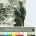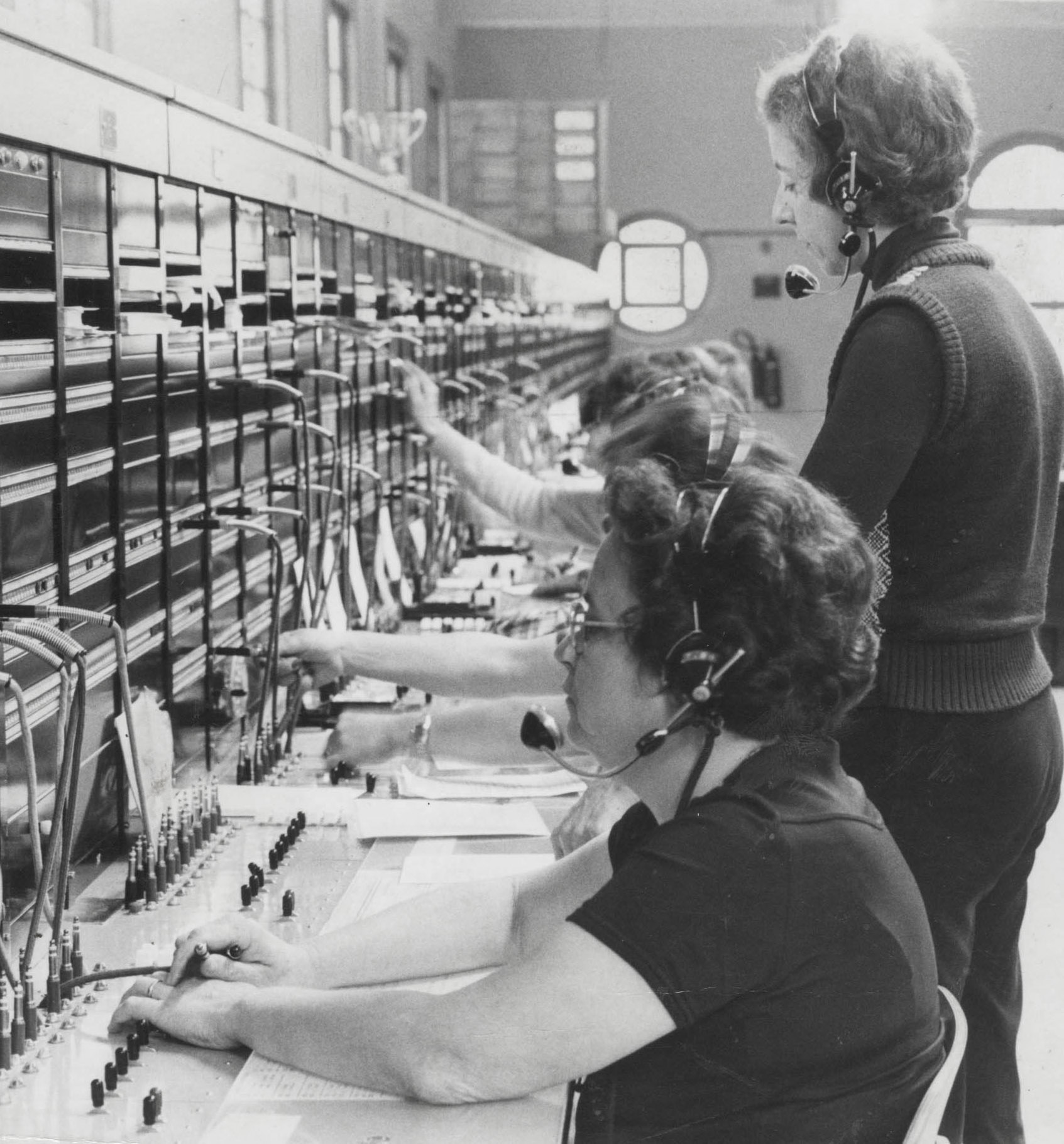 Fotografia em preto e branco. No primeiro plano, ao centro, telefonista sentada de frente para mesa telefônica. No segundo plano, telefonistas sentadas de frente pra mesa telefônica com uma telefonista de pé atrás delas. Ao fundo, parede com janelas e um extintor.