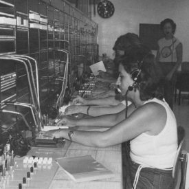 Fotografia em preto e branco. No primeiro plano, quatro telefonistas sentadas de frente para mesa telefônica estando a primeira, da esquerda para direita, com monofone em uma das mãos em direção ao rosto. No segundo plano, no lado esquerdo, parede com porta, ao centro, parede com extintor e relógio pendurados, e no lado direito, possível equipamento à frente da parede.