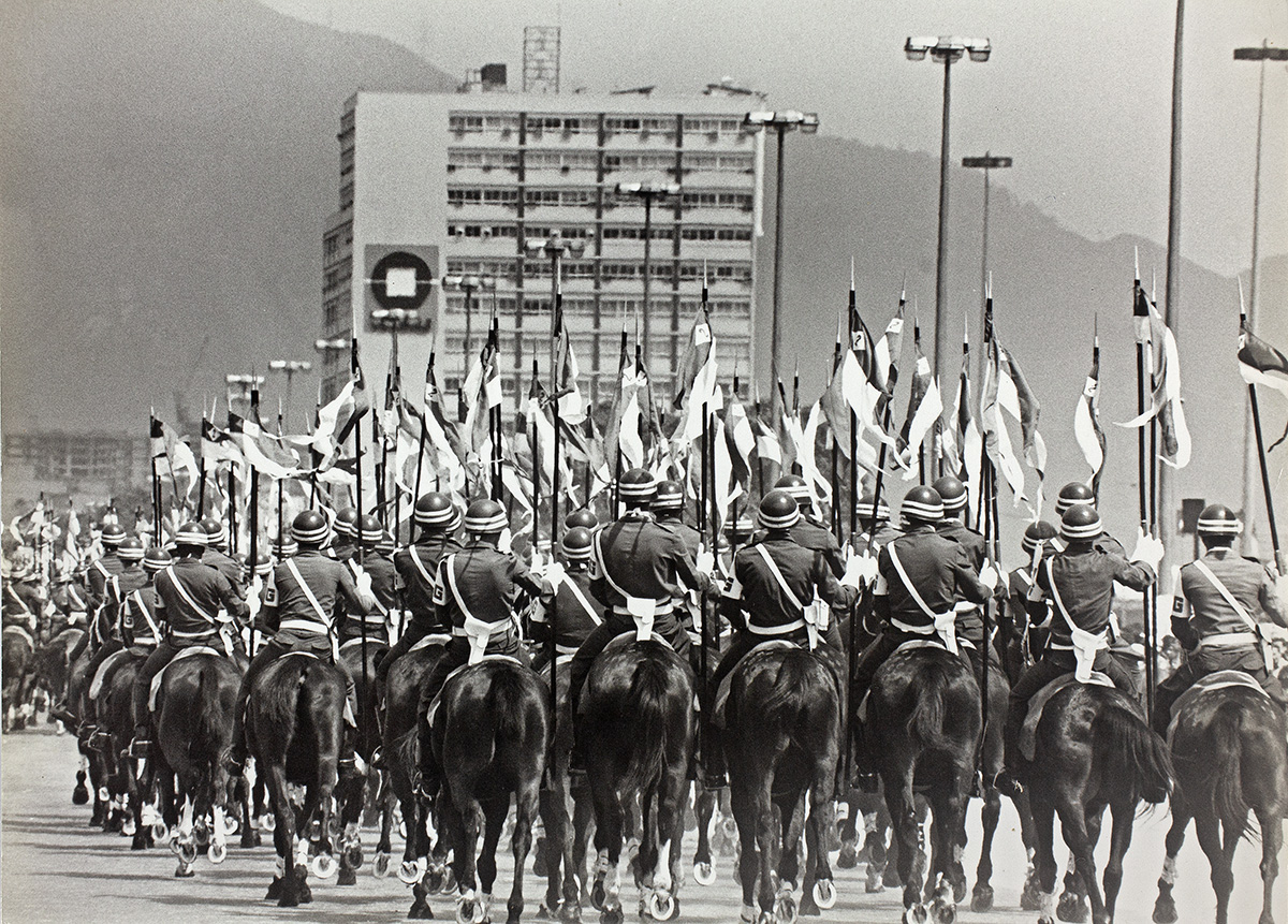 Fotografia preto e branco. Em primeiro plano, ao centro, batalhão montado à cavalo, de costas, trajando farda militar e levando bandeirolas. Ao fundo, ao centro, edifício com a logomarca da Telerj.
