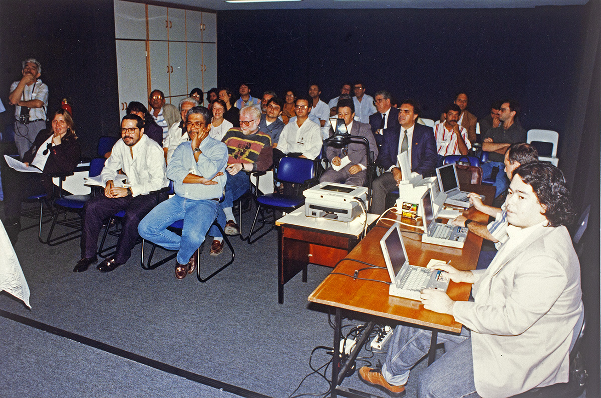 Fotografia colorida. Interior de auditório com pessoas sentadas em cadeiras de frente voltadas para a esquerda. À direita, dois homens sentados diante de mesa com computadores.