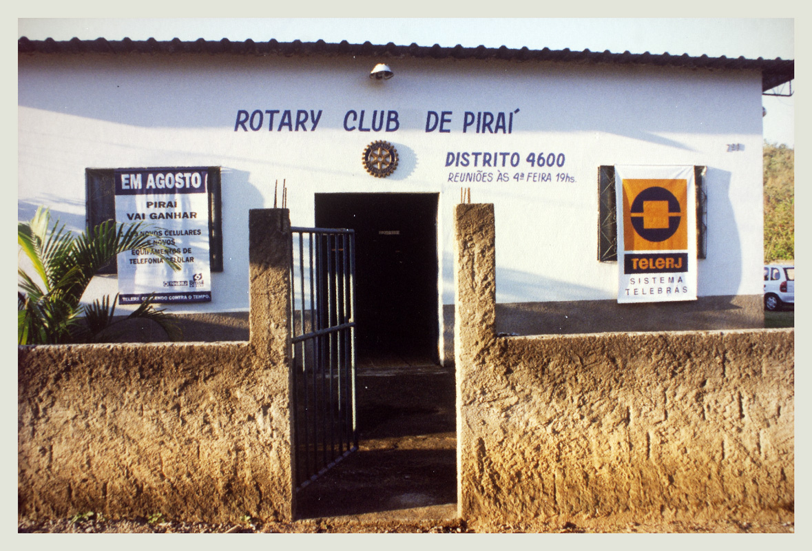 Fotografia colorida. Parte de fachada, tendo ao centro portão e porta abertos do Rotary Club de Piraí; símbolo do Rotary Club acima da porta. À esquerda da porta, cartaz com a inscrição "EM AGOSTO / PIRAÍ / VAI GANHAR / 1.189 NOVOS CELULARES / E NOVOS/ EQUIPAMENTOS DE / TELEFONIA CELULAR / TELERJ BRASIL / EM AÇÃO / TELERJ. CORRENDO CONTRA O TEMPO." e à esquerda, outro cartaz com a logomarca e inscrição "TELERJ / SISTEMA / TELEBRÁS".