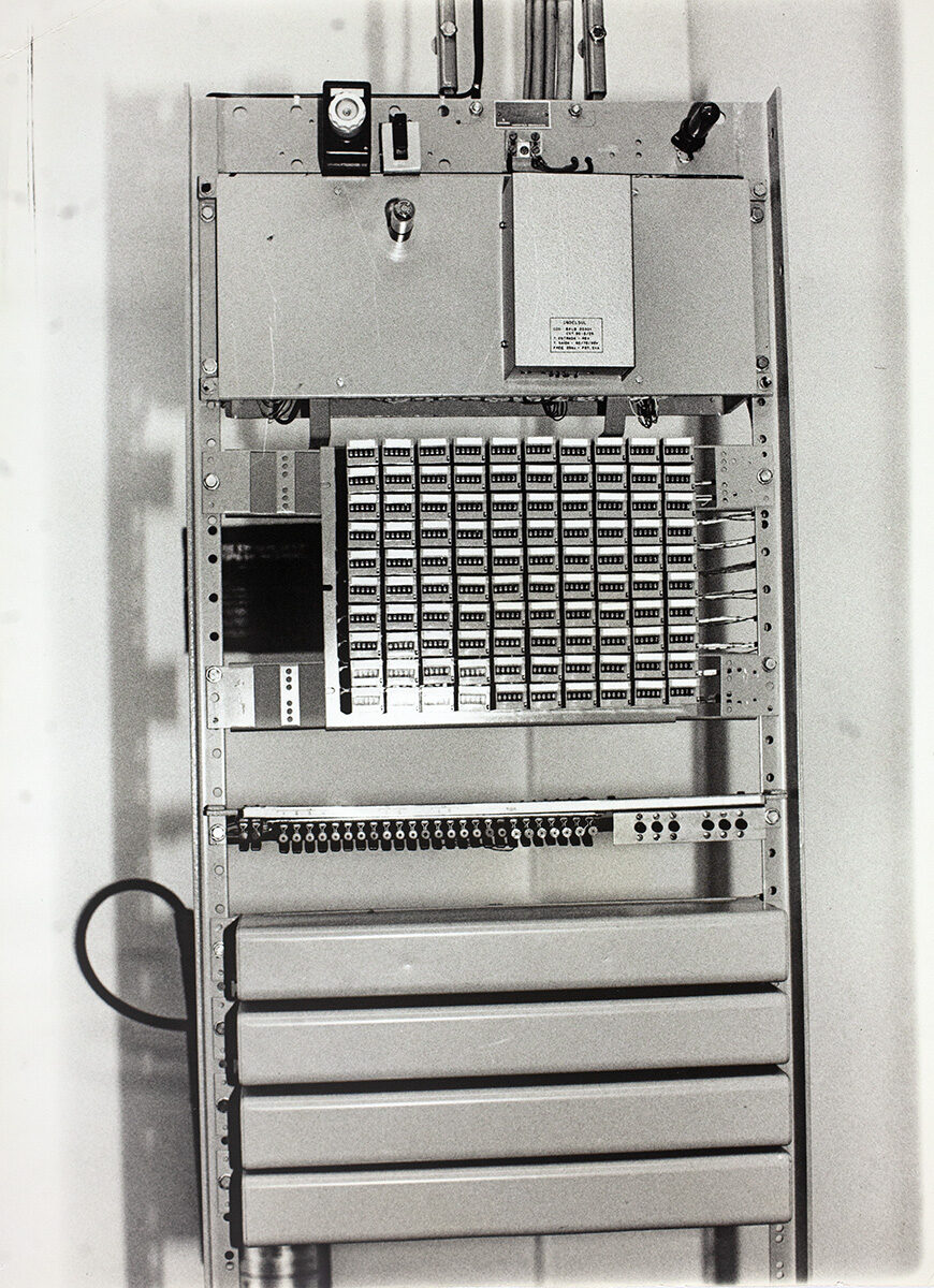 Fotografia em preto e branco. Imagem de parte de aparelho de estação telefônica com estrutura vertical em formato retangular, em metal, com botões, dispositivos de entrada e saída e fios dispostos em quatro conjuntos horizontais.