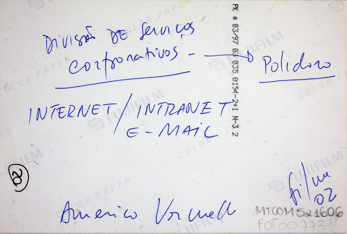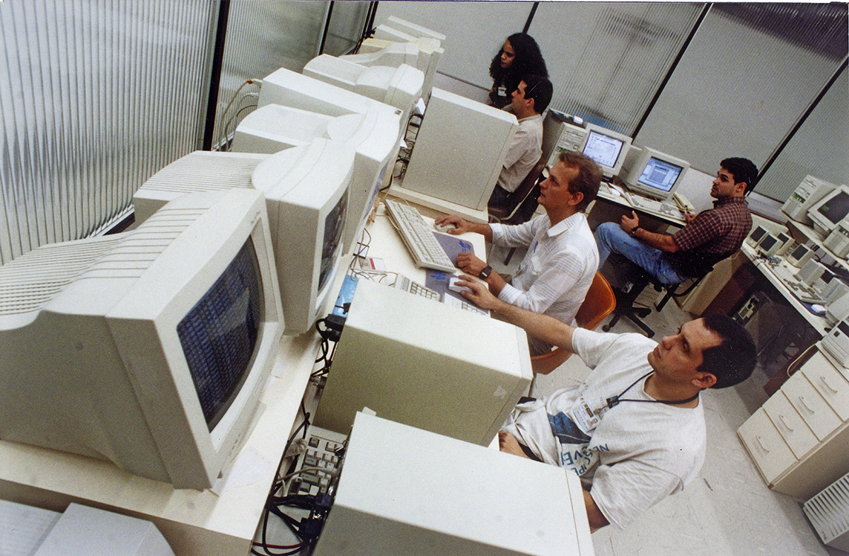 Fotografia colorida em Botafogo no Rio de Janeiro. Em primeiro plano, à esquerda, mesa com computadores, dois homens sentados com crachá, à direita, parte de mesa com computadores. Em segundo plano, à esquerda, mesa com computadores, homem sentado e mulher em pé, ao centro, mesa com computadores e homem sentado. Ao fundo, divisória transparente.