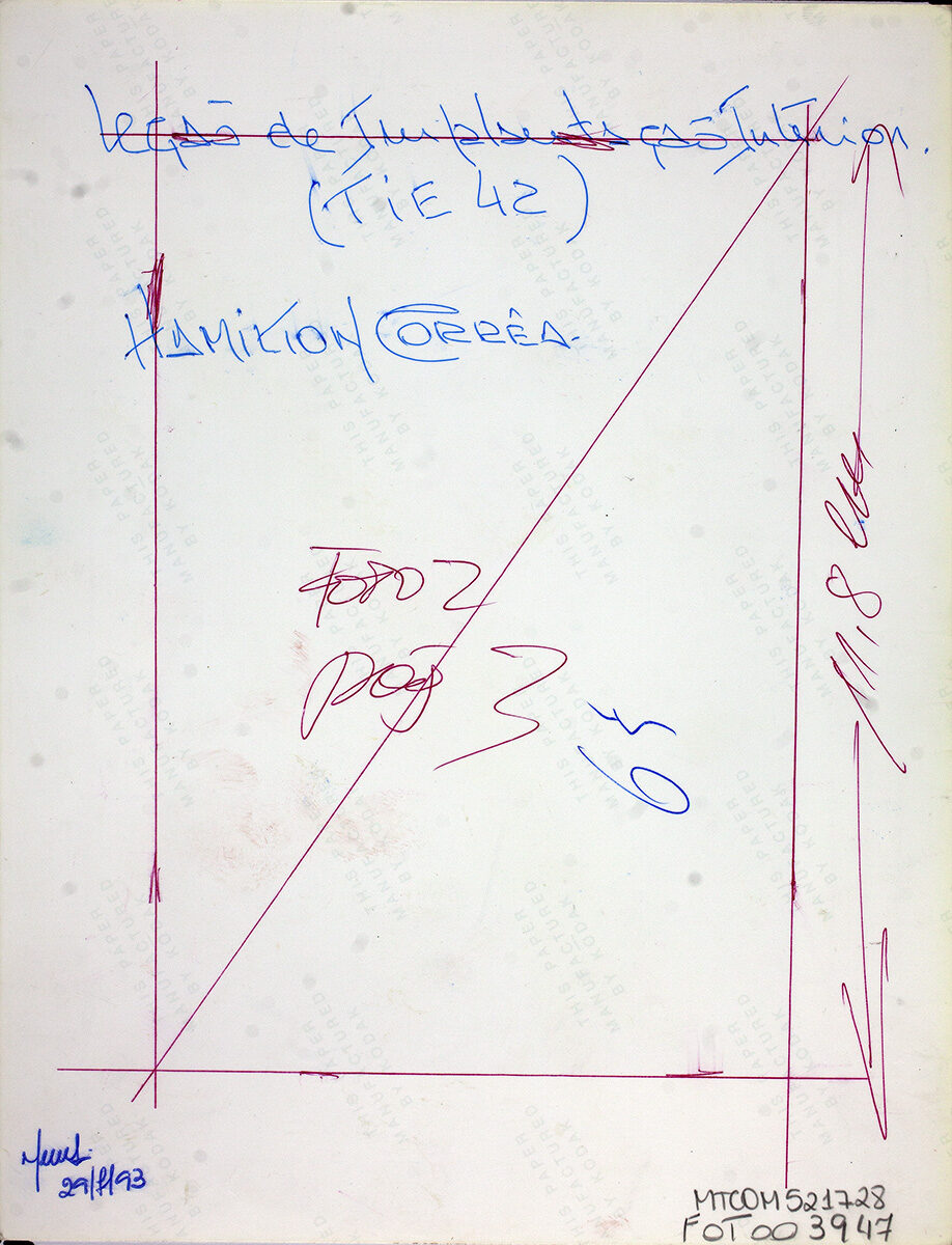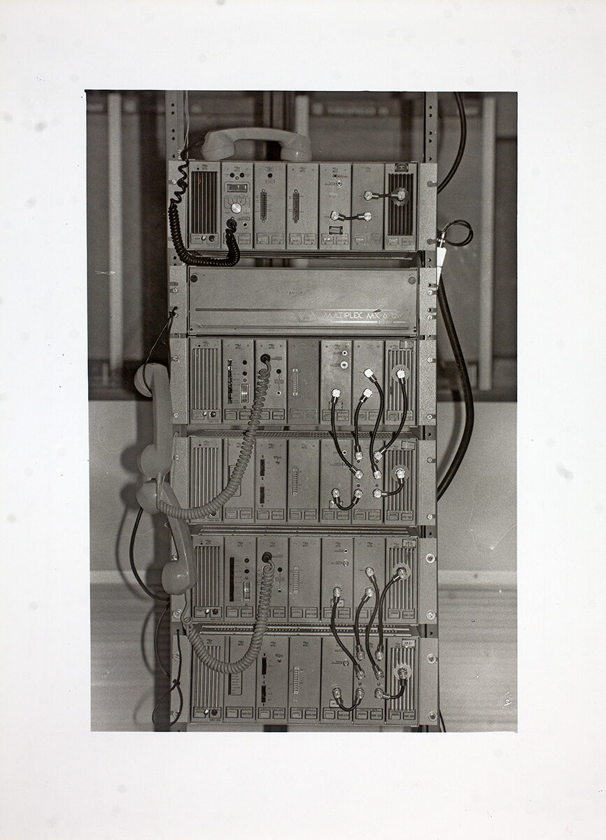 Fotografia em preto e branco. No primeiro plano, equipamento em formato retangular, sendo possivelmente um multiplexador, contendo botões, entradas, cabos e três monofones presos ao mesmo. O equipamento apresenta a inscrição "MULTIPLEX MX-6-1(...). Ao fundo, desfocado, possível parede.
