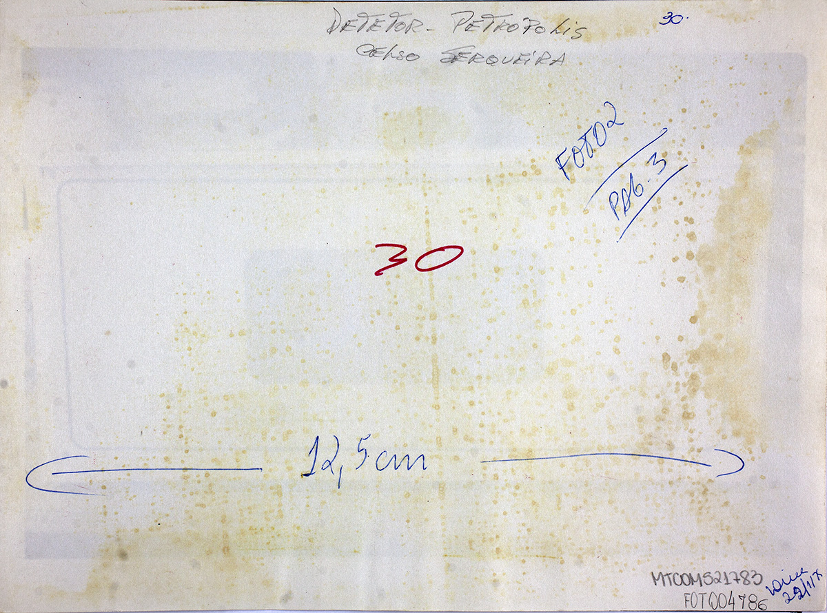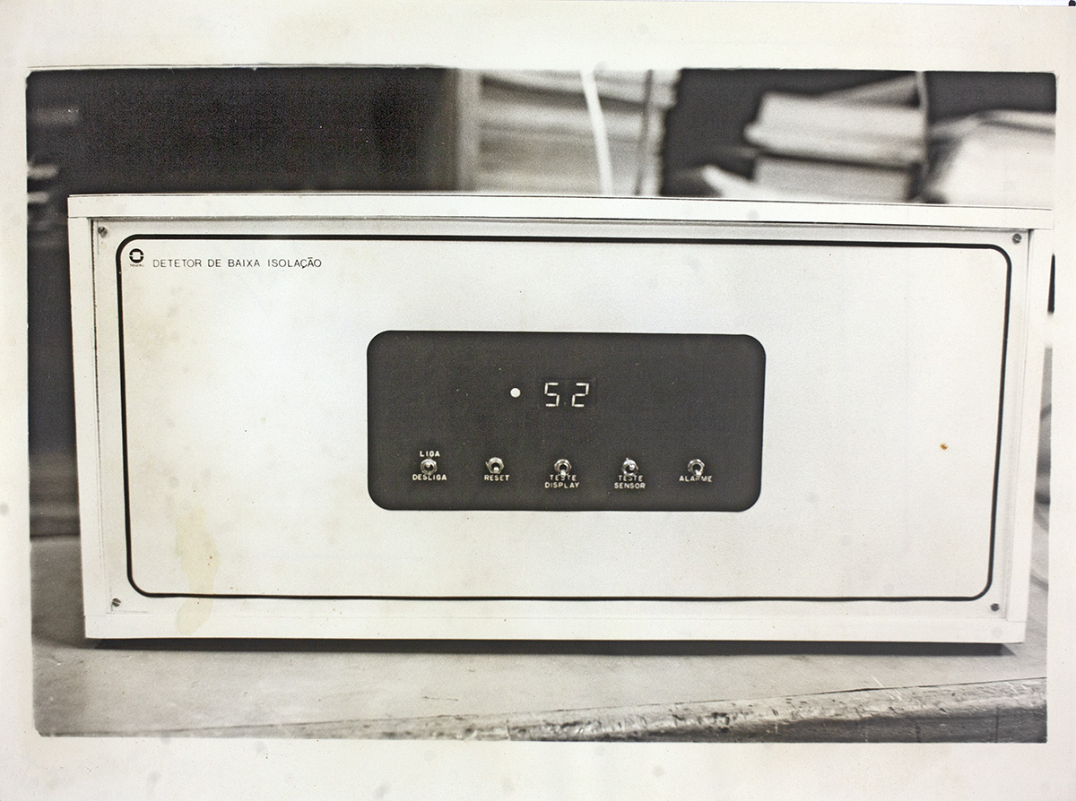 Fotografia em preto e branco no Petrópolis - RJ. Em primeiro plano, ao centro, equipamento retangular, tendo no canto superior esquerdo logo e inscrição "TELERJ", "DETETOR DE BAIXA ISOLAÇÃO", ao centro painel com as inscrições "52", "LIGA/DESLIGA; RESET; TESTE DISPLAY; TESTE SENSOR; ALARME". Ao fundo, desfocado, objetos.
