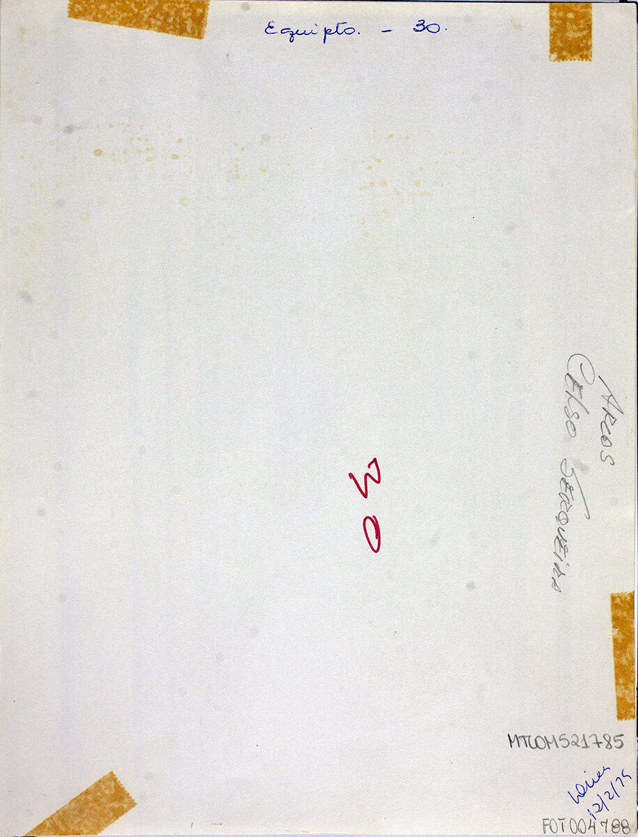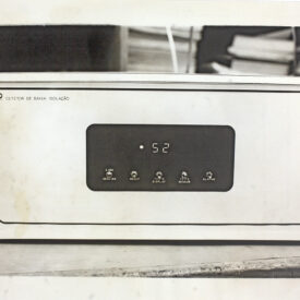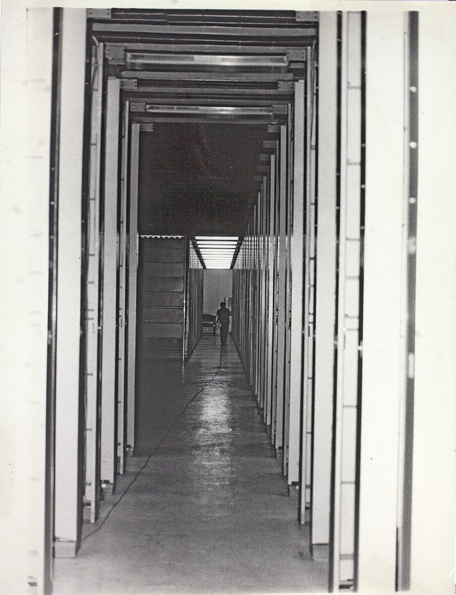 Fotografia em preto e branco Rio de Janeiro - RJ. Em primeiro plano, à esquerda e à direita equipamentos, do chão ao teto, enfileirados, ao centro corredor. Ao fundo, no centro pessoa em pé segurando objeto com fio estendido pelo corredor, atrás parte de banco e parede.