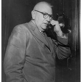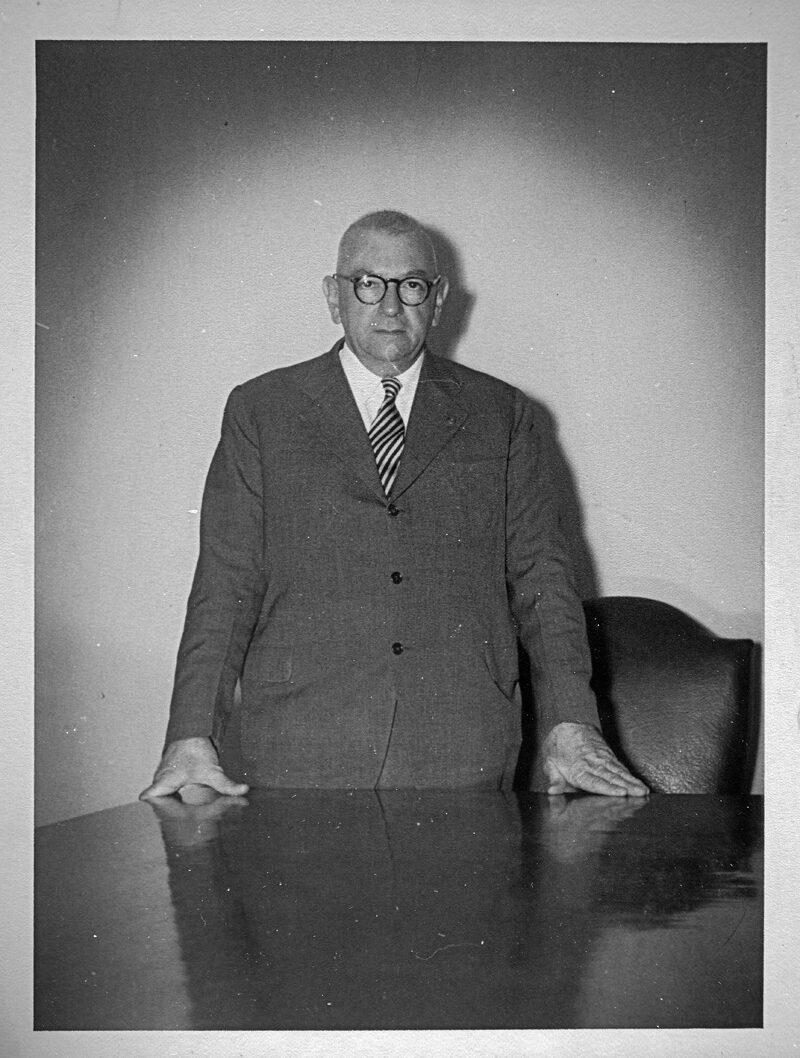 Fotografia em preto e branco. No primeiro plano, mesa. No segundo plano, de frente da mesa, Pedro Renaut Castanheira, criador e fundador da Companhia Telefônica de Minas Gerais.