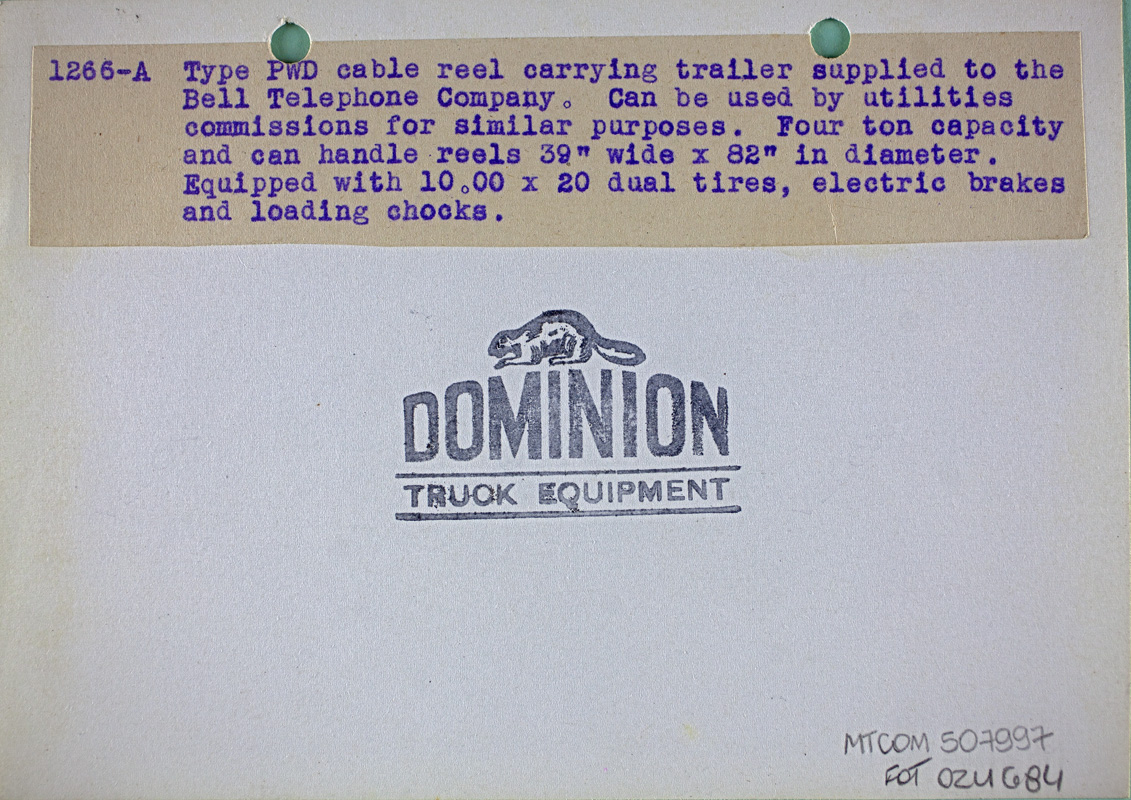 "Reboque enrolador de cabo da Bell Telephone Company - Dominion Truck Equipment"