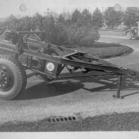 Fotografia em preto e branco. No primeiro plano, Reboque enrolador de cabos, da Bell Telephone Company, com o número 57548 gravado na lateral. No segundo plano, arbusto e veículo à direita. Ao fundo, árvores.