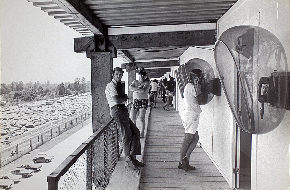 Fotografia em preto e branco. No primeiro plano, à direita, telefone público / orelhão de disco, com cúpula transparente, preso à parede de varanda de prédio. No segundo plano, dois homens em pé em frente à cerca da varanda e telefones públicos / orelhões de cúpula transparente presos à parede, com um deles sendo utilizado por homem. Ao fundo, à esquerda, abaixo do prédio, estacionamento com diversos carros e árvores; à direita, pessoas em pé na varanda.