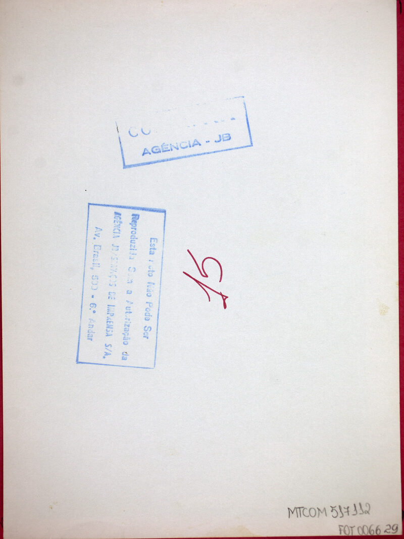 Fotografia em preto e branco em Brasília. Em primeiro plano parte de mesa, cinzeiro, aparelhos, papel, telefone. Em segundo plano à esquerda, homem em pé, de terno, à direita o Ministro das Comunicações Haroldo Correia de Mattos, de terno em pé, usando o telefone. Ao fundo, ao centro dois mastros e duas bandeiras e cortina.