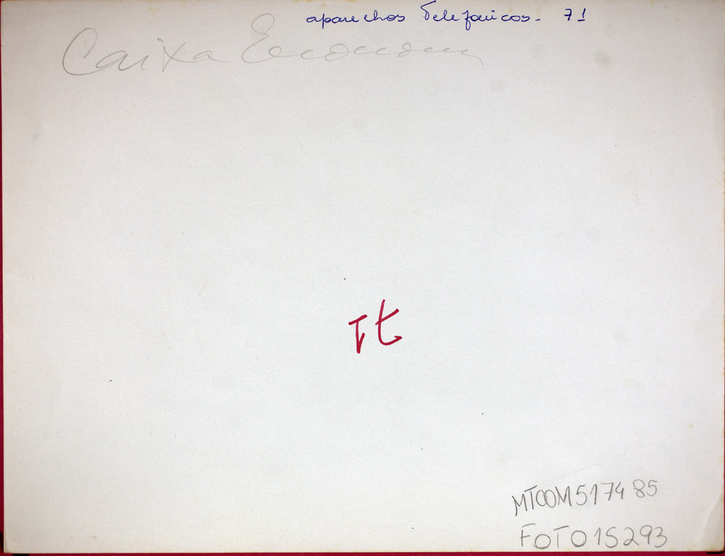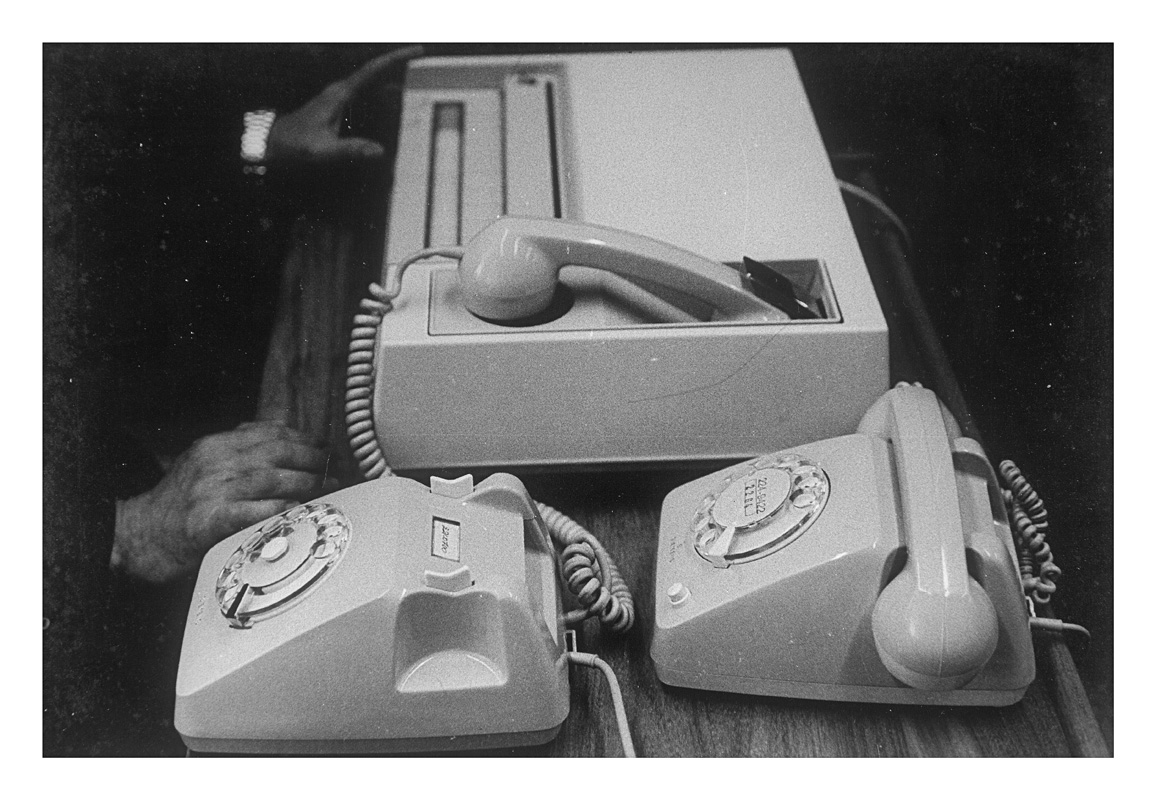 Fotografia em preto e branco. Um aparelho retangular e dois aparelhos de telefone com painel numérico de disco, voltados para a esquerda, sobre mesa de madeira; fone do aparelho de telefone à esquerda, encaixado no aparelho maior. Á esquerda, duas mãos apoiadas sobre a mesa.