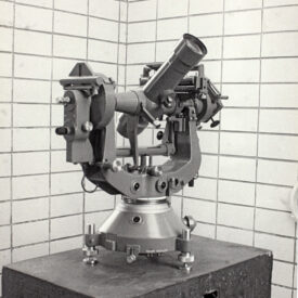 Fotografia em preto e branco. Em primeiro plano, à esquerda, homem de pé, de costas. Ao fundo, ao centro, nave espacial, em forma cilíndrica terminada em cone, em plataforma de lançamento. No corpo, acima a inscrição "UNITED STATES";à direita, estrutura metálica vazada.