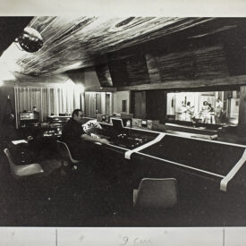 Fotografia em preto e branco. Em campo, à direita, homem de pé, levemente voltado para esquerda, manuseando equipamento à sua frente, denominado Microscópio de Inspeção Industrial Microzoom, fabricado pela Bausch & Lomb. À esquerda, monitor e outros equipamentos.