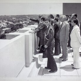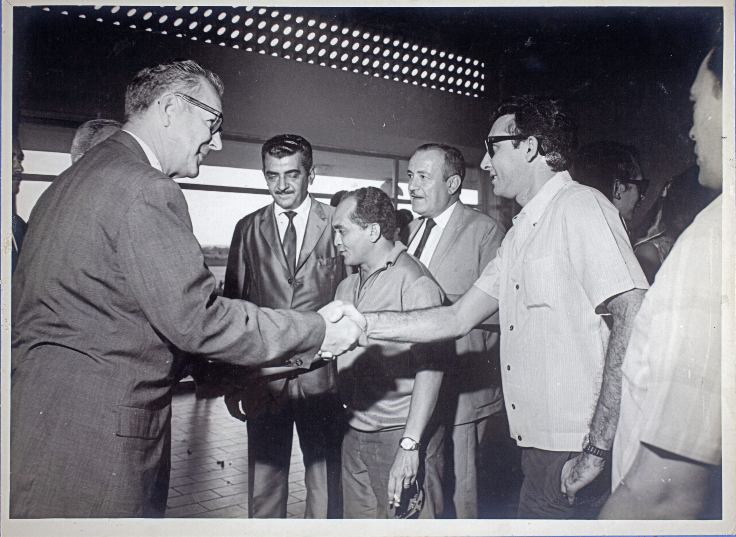 Fotografia em preto e branco colada na lateral esquerda de folha de álbum de fotografias “Solenidade de Inauguração DDD-DDI – Em Teresina”. A fotografia apresenta, em primeiro plano, parte de homem em pé à direita. Atrás, dois homens em pé, um à esquerda e o outro à direita, apertando as mãos. Em segundo plano, grupo de homens em pé. Ao fundo, parede com janelas.