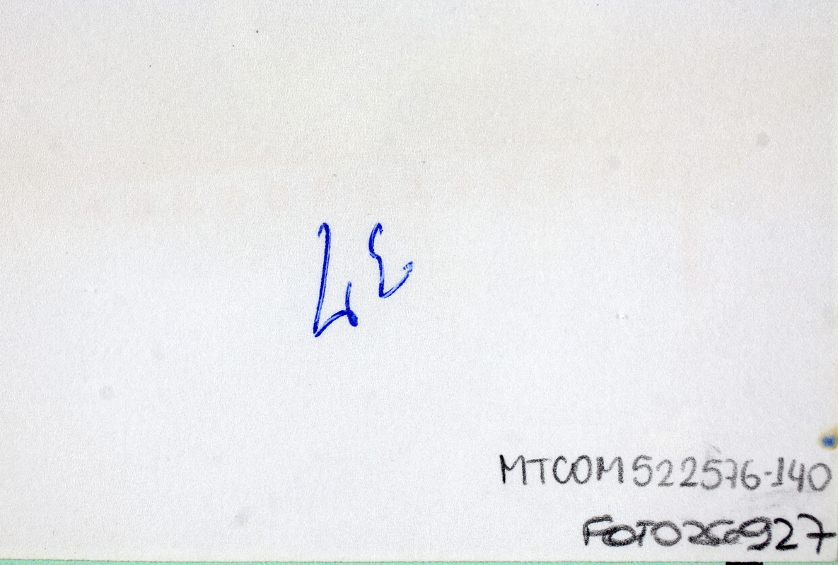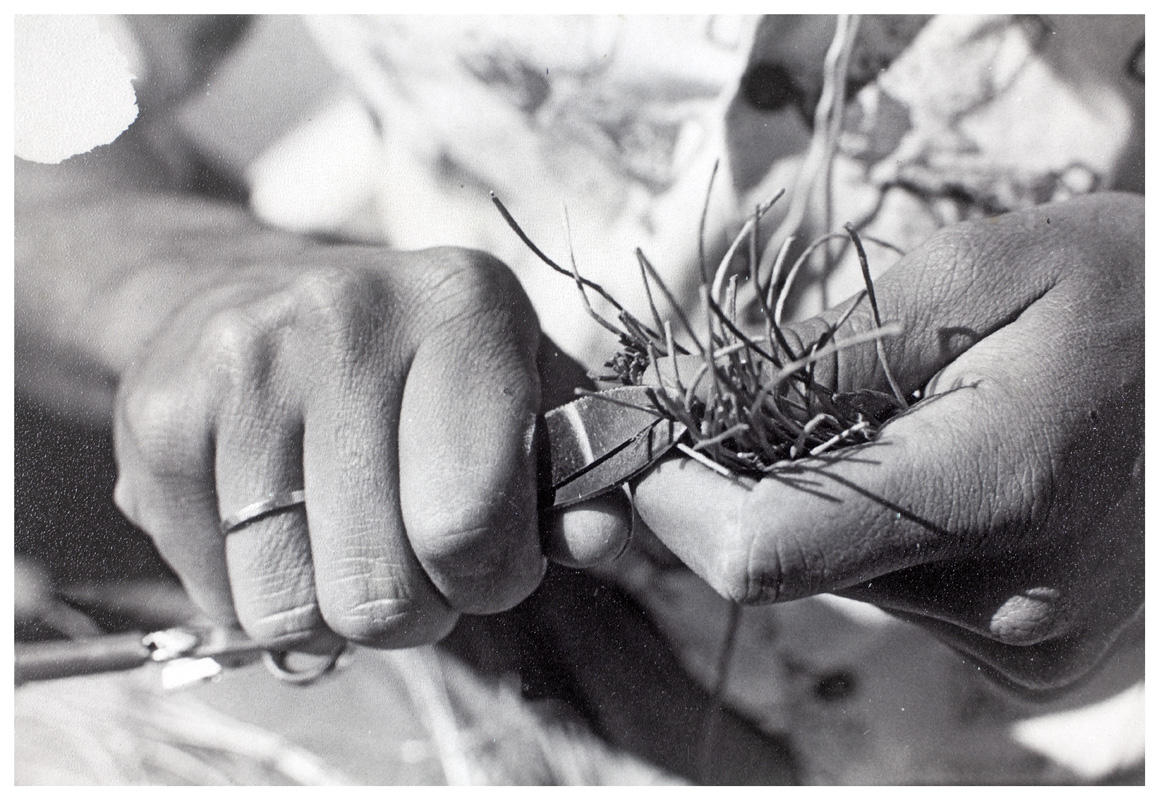 Fotografia de álbum da Telemig. Fotografia em preto e branco em Minas Gerais. Imagem de parte de possível funcionário segurando tesoura com uma das mãos em direção a emaranhado de fios que ele está segurando com a outra mão.