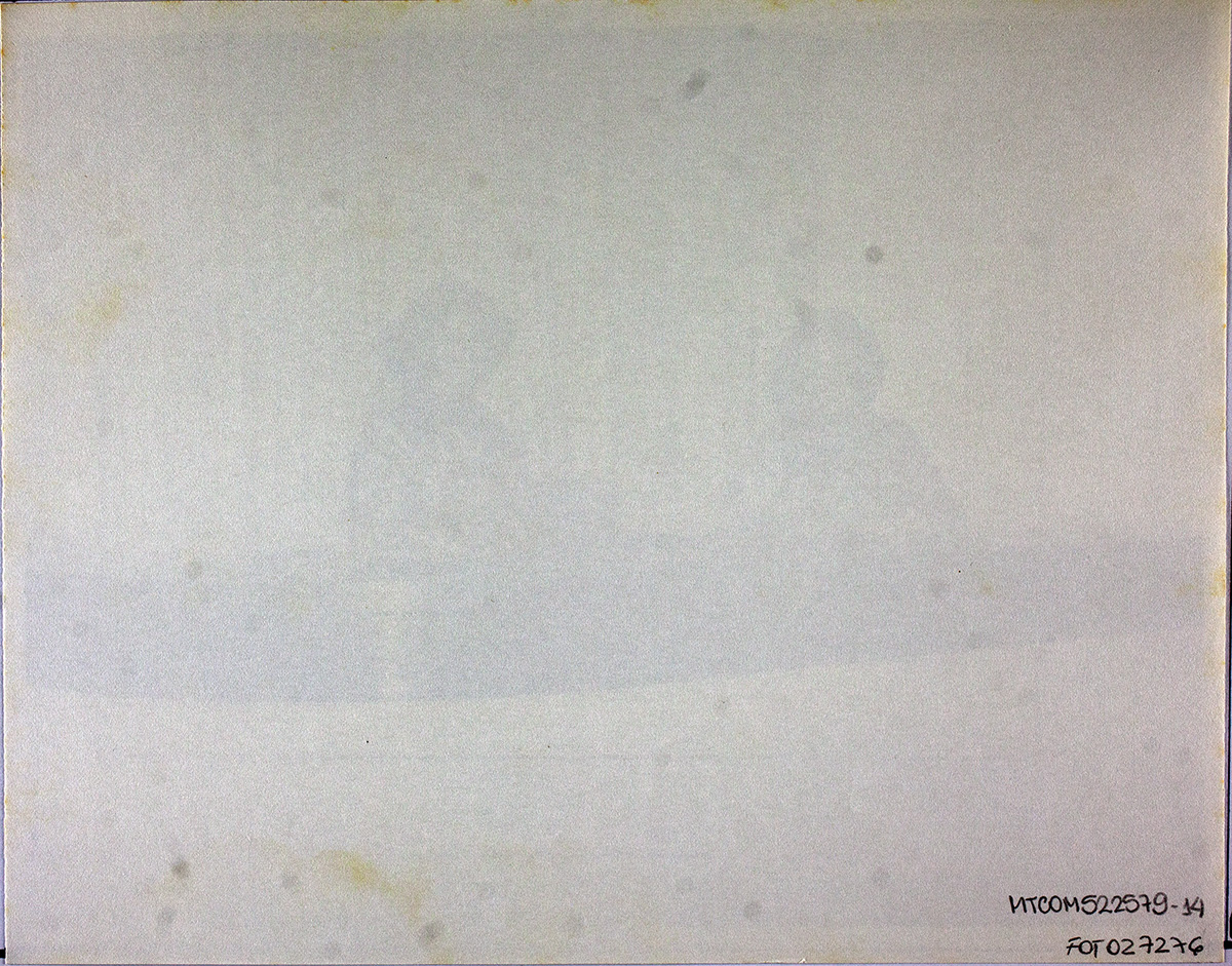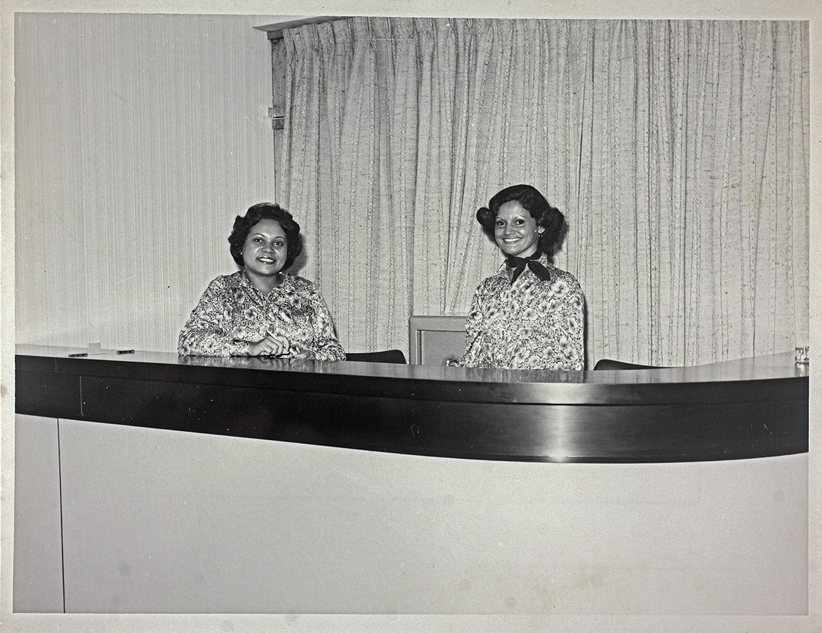 Fotografia de álbum da Teleceará. Fotografia em preto e branco em Fortaleza, no Ceará. Em primeiro plano, parte de balcão com duas possíveis funcionárias da Teleceará atrás, utilizando uniformes. A funcionária da esquerda está com um dos braços sobre o balcão. Atrás delas, partes de cadeiras. Ao fundo, parede com cortina.