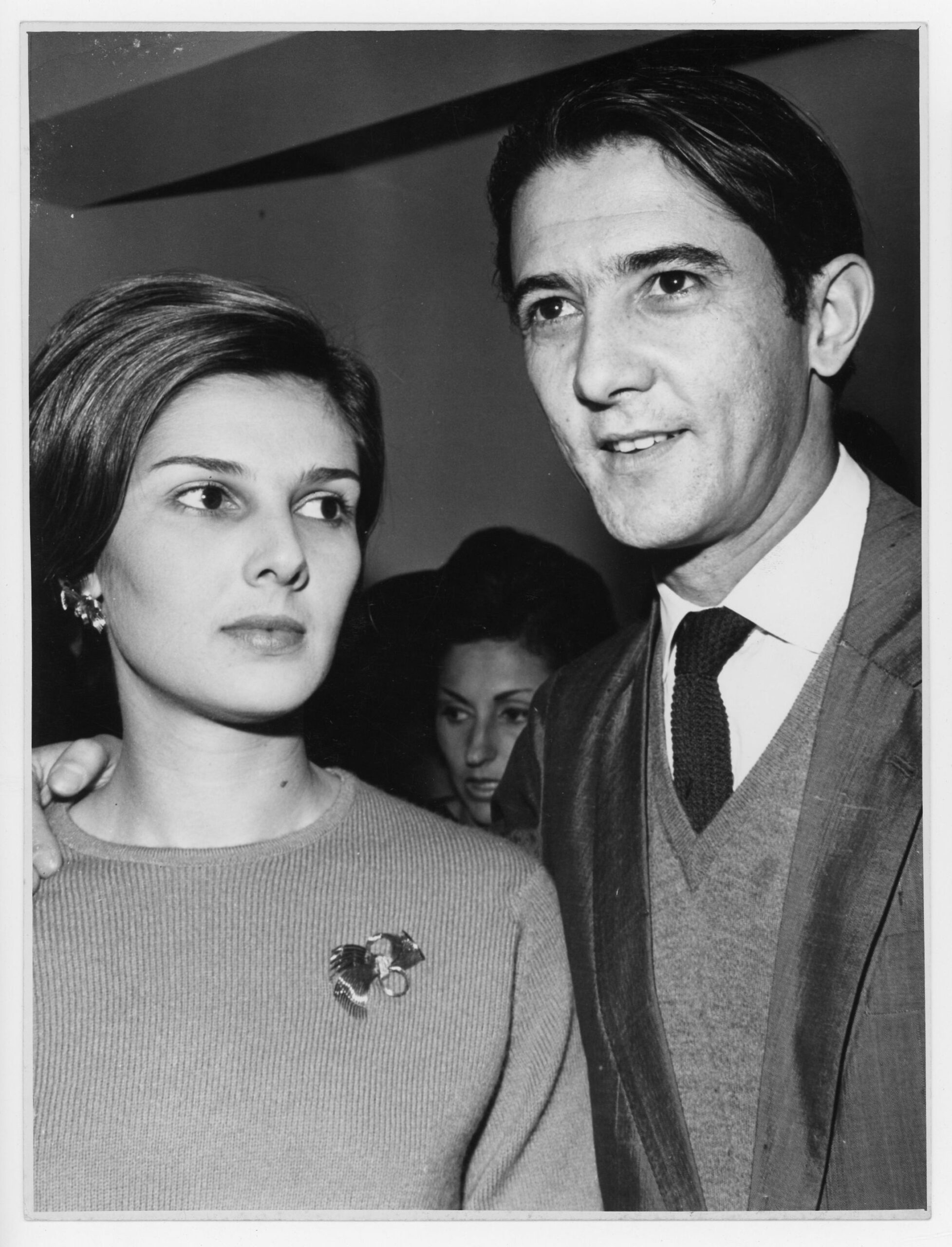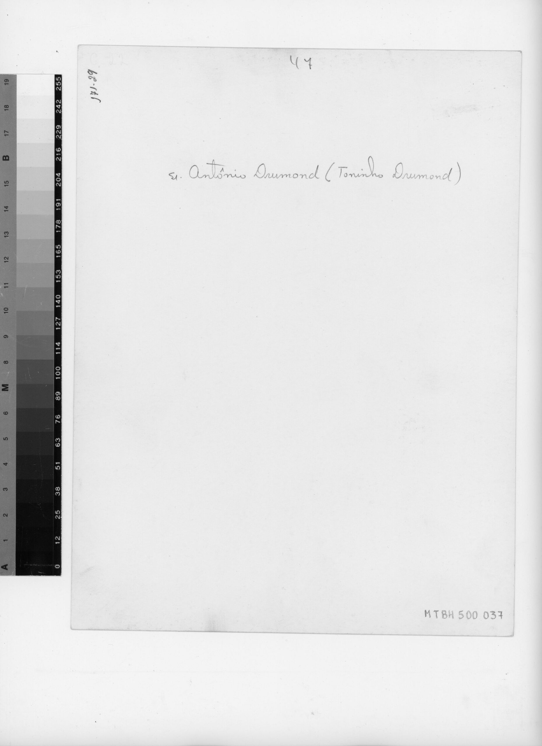 Fotografia em preto e branco em Araxá, em Minas Gerais. No primeiro plano, o jornalista Antônio Carlos Drumond e sua esposa à esquerda. No segundo plano, parte de rosto de mulher. Ao fundo, parede.
