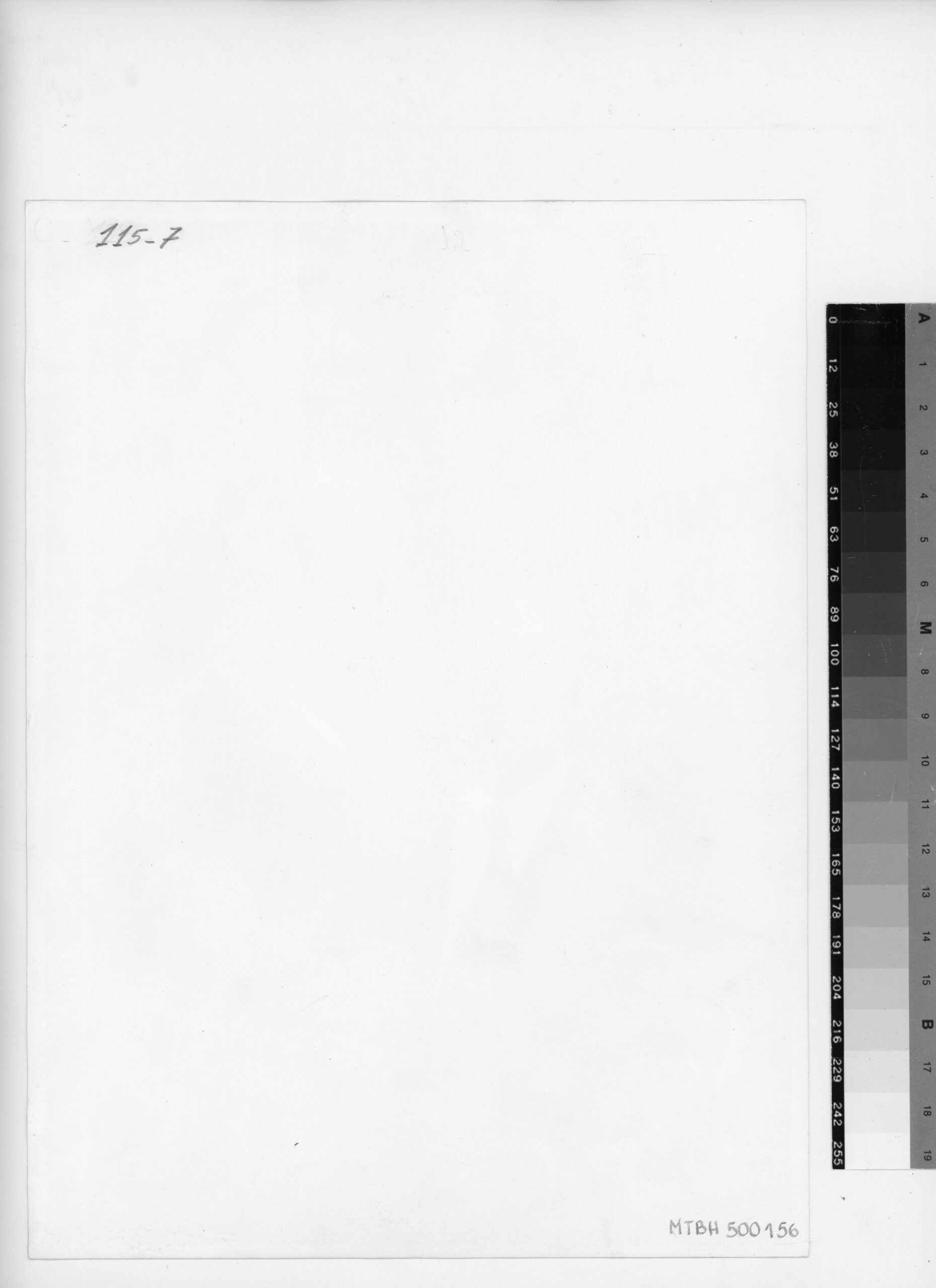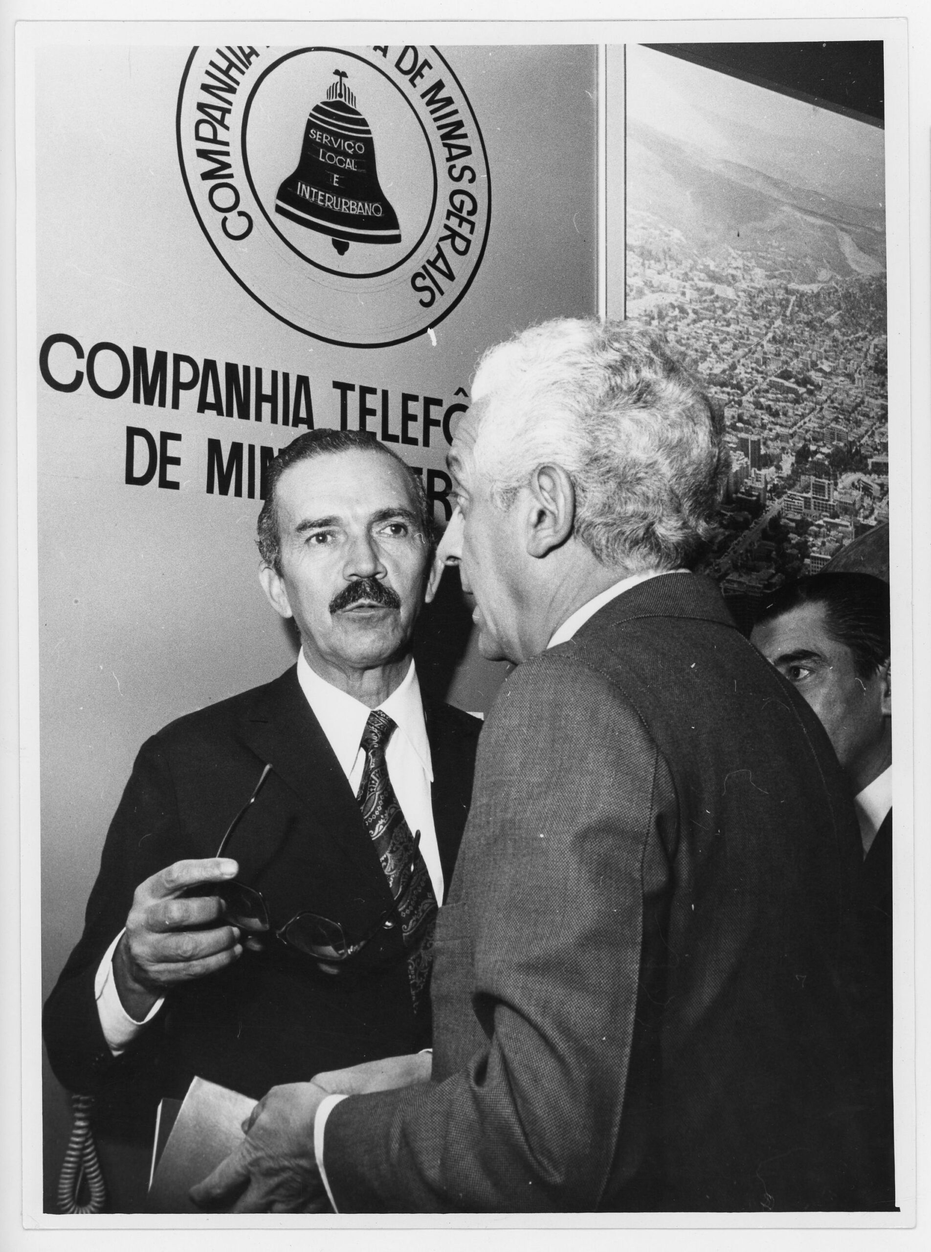 Fotografia em preto e branco em Minas Gerais. No primeiro plano, homem em pé, de lado, utilizando terno. No segundo plano, à esquerda, o General José Antônio de Alencastro e Silva em pé, segurando óculos. À direita, parte de rosto de homem. Ao fundo, mural contendo logomarca da Companhia Telefônica de Minas Gerais (CTMG) e imagem de vista aérea de cidade ao lado.