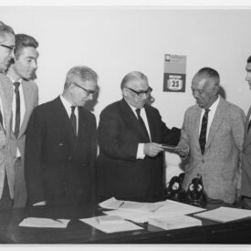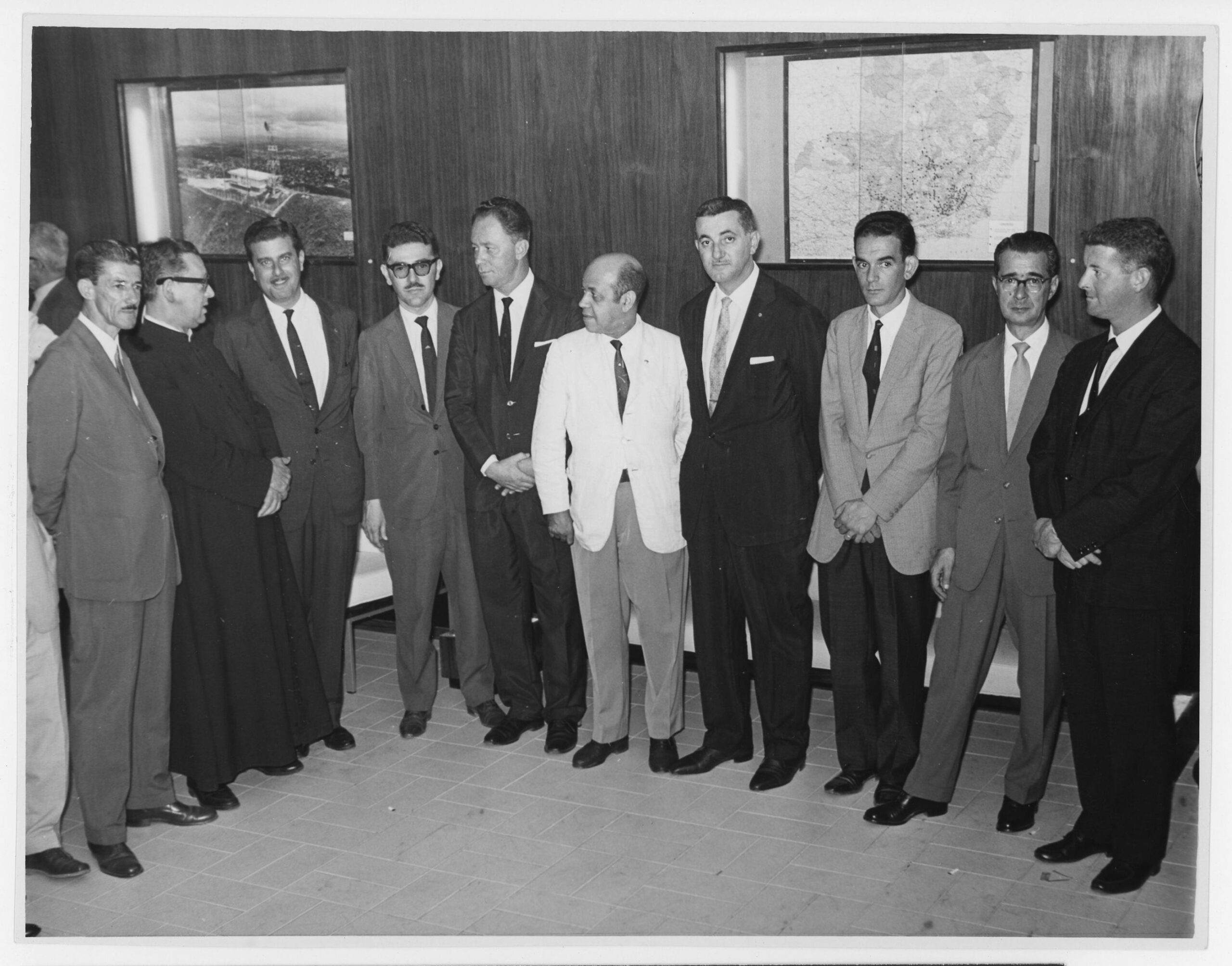 Fotografia em preto e branco em Minas Gerais. No primeiro plano, grupo de homens em pé utilizando ternos. Entre eles, à esquerda, está o diretor Lima Melo e um padre utilizando batina. No segundo plano, parte de sofá. Ao fundo, parede de madeira com dois quadros pendurados.
