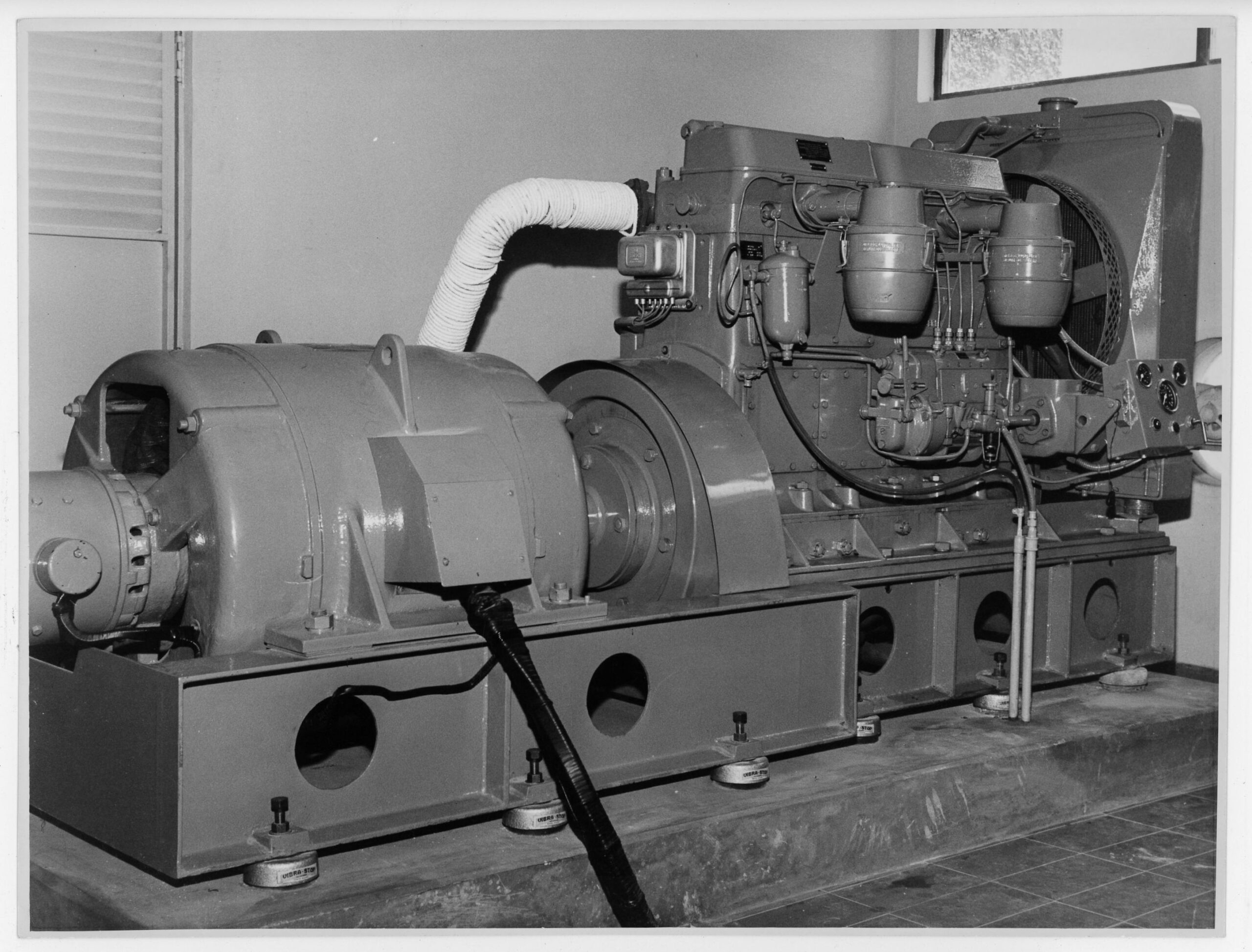 Fotografia em preto e branco, em Minas Gerais. No primeiro plano, equipamento grande, com a parte inferior possuindo cinco círculos vazados e um tubo preto saindo dele em direção ao chão, na parte superior um tubo branco liga a parte esquerda à direita, no canto direito dele um aparelho de ventilação.